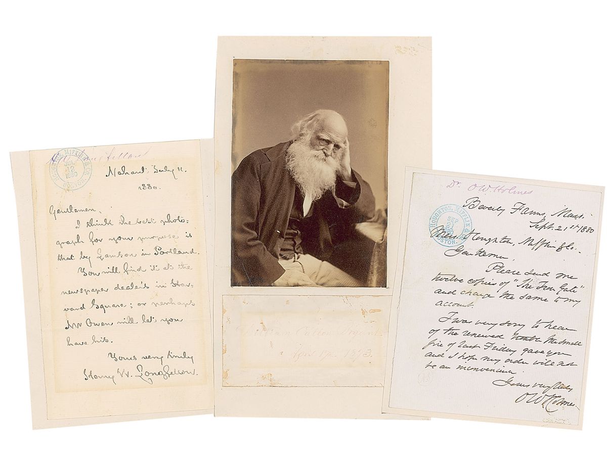 Collection of three items, each signed by a significant member of the 19th–century New England group termed the ‘Fireside Poets,’ including: Henry W. Longfellow (ALS mentioning a photographic portrait), Oliver Wendell Holmes, Sr. (ALS mentioning his poem “The Iron Gate”), and William Cullen Bryant (signature affixed below an albumen portrait). Various toning and the Bryant signature extremely faded, otherwise overall fine condition.