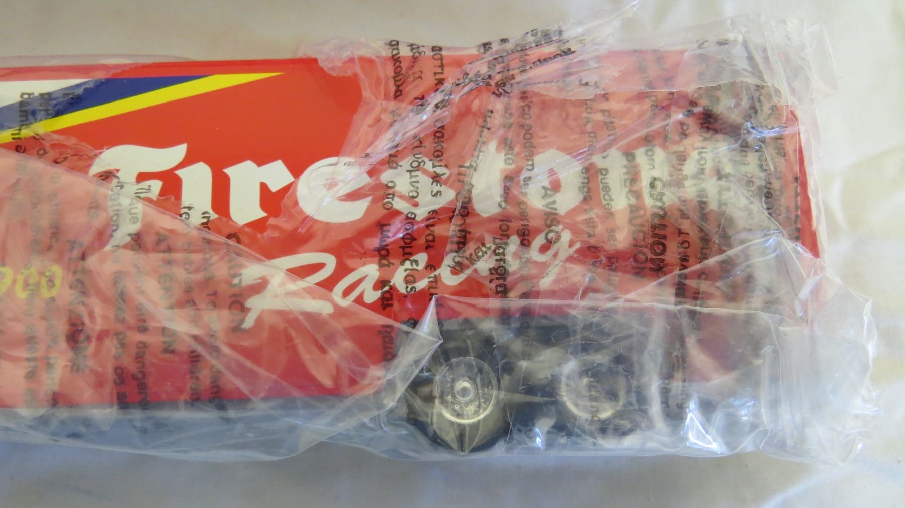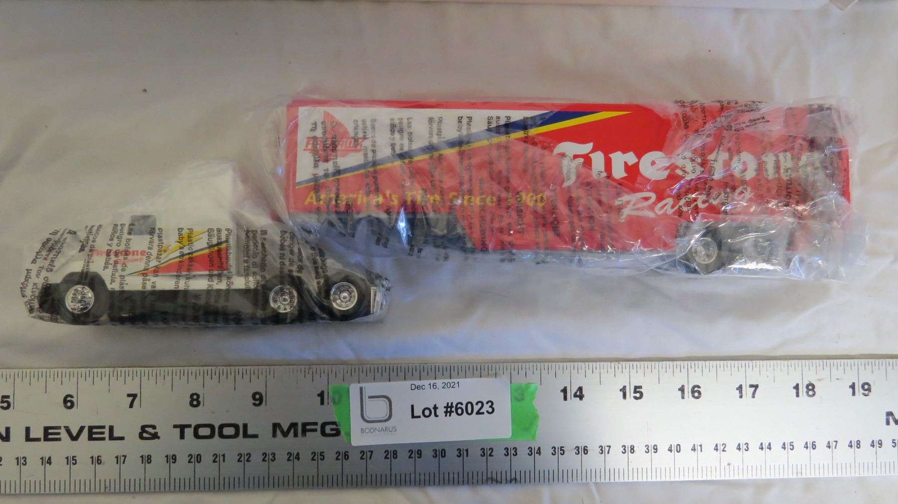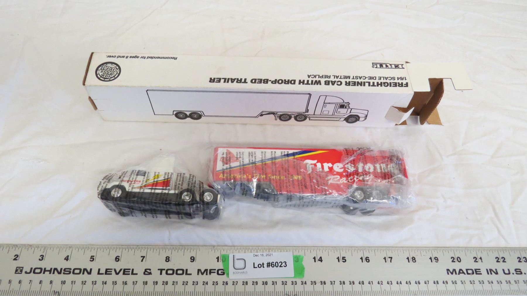 Firestone racing freightliner cab with drop-bed trailer - ERTL 1:64 Die-cast (NIB)