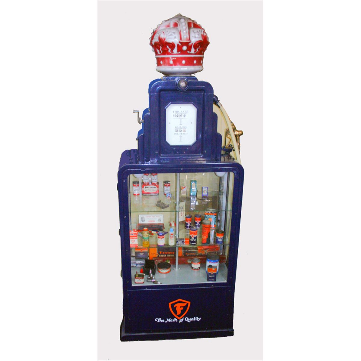 Double Showcase Gas Pump - 1935 Firestone Wayne 50 display pump with original porcelain Firestone Signs. Contents of pump NOT included.