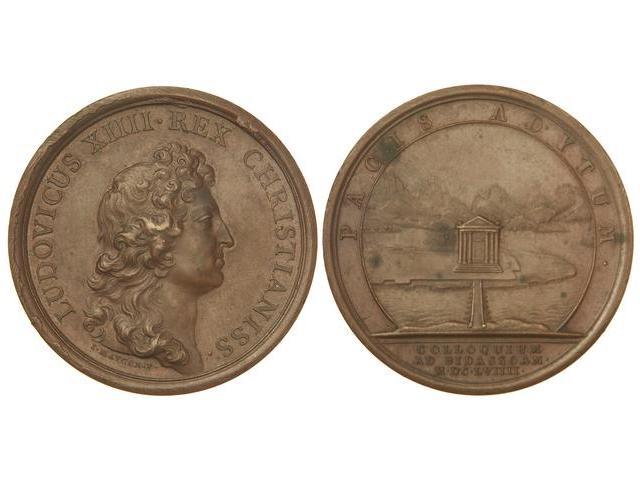 Firma del Tratado de Paz de los Pirineos. - 1659. - FRANCIA. - Anv.: LVDOVICVS XIIII.REX CHRISTIANISS. Busto a derecha. Rev.: PACIS ADYTUM. Isla fluvial con templo. En exergo: COLLOQUIUM AD BIDASSUAM. M.DC.L.VIIII. Br. Ø 41 mm. (Manchitas). EBC. - -