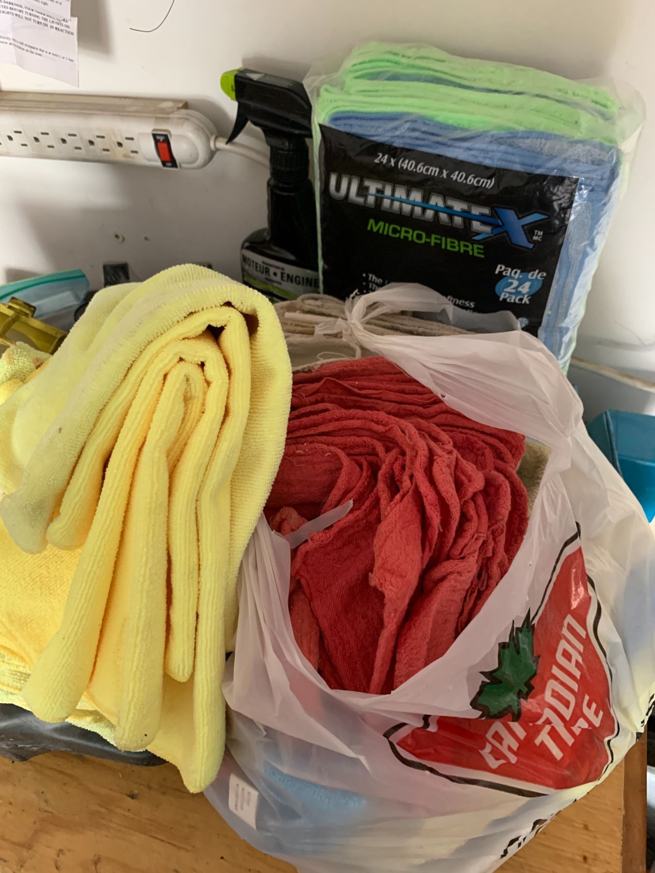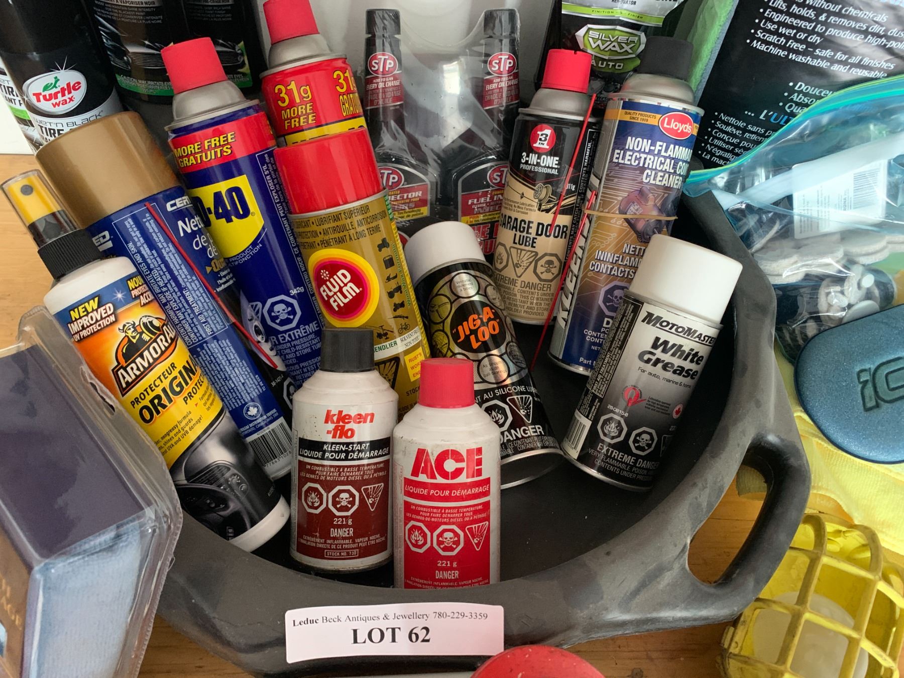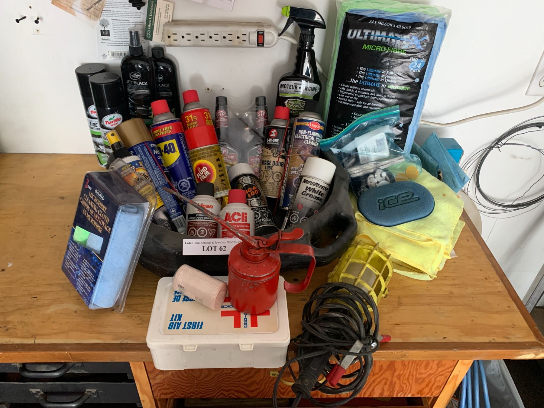 First Aid Kit, Oil Pan, Automotive Cleaners and Greasers, Microfiber Clothes, Battery Hookup Trouble Light, Mini Oil Can & Bag of Furniture Pads