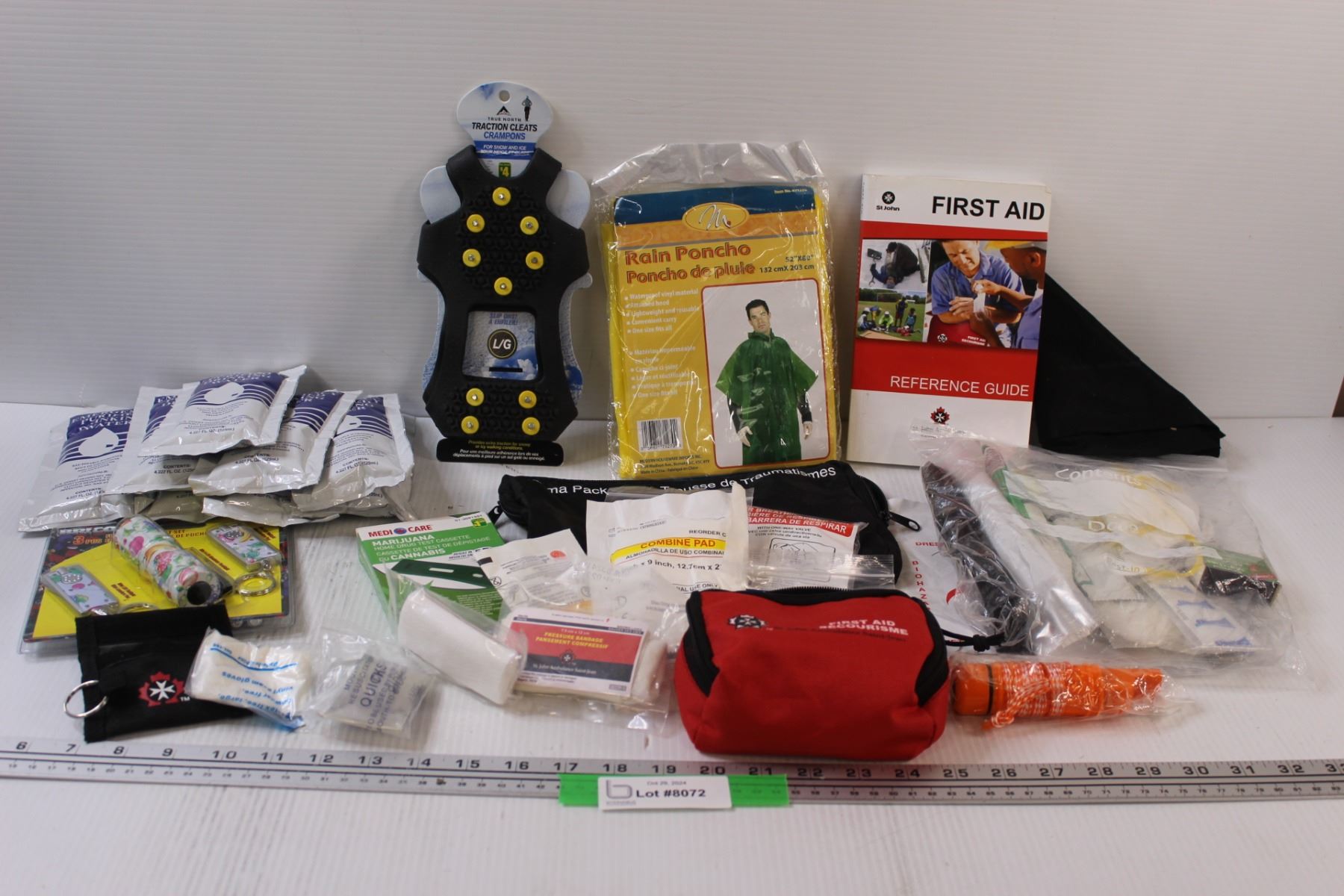 First-Aid Reference Guide, (7) Emergency Drinking Water - Past Best Before Date, First - Aid Kit, Biohazard Disposal Bag, Flashlight Set, Traction Cleats, Rain Poncho, Misc.