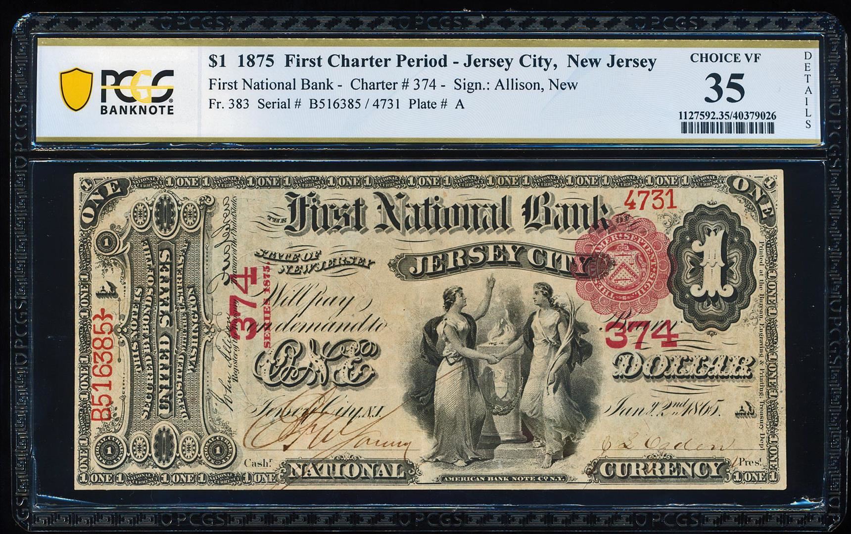 First Charter 1875 $1 Jersey City, NJ CH# 374 National Note PCGS Choice Very Fine 35