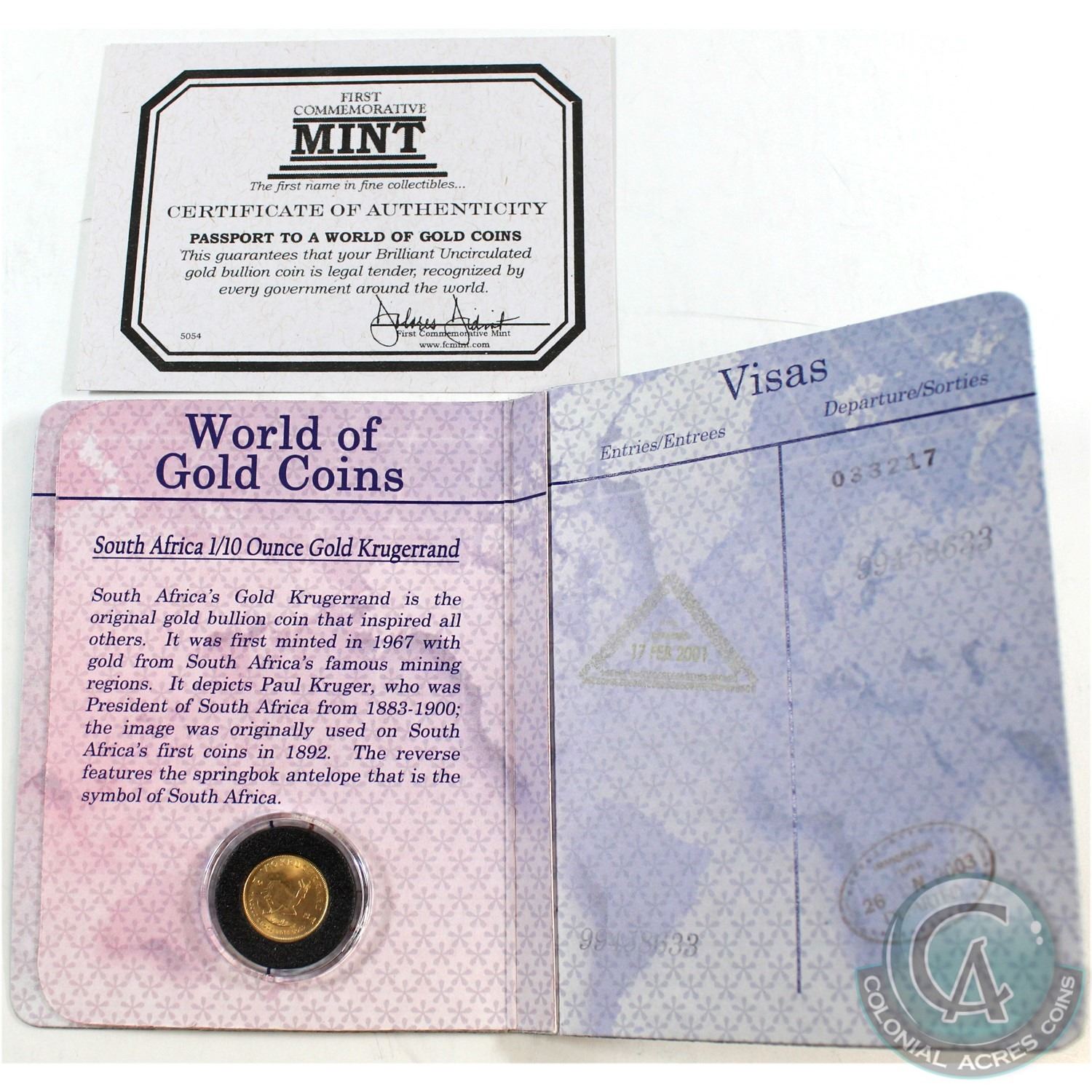 First Commemorative Mint Issue: 1984 South Africa 1/10 Gold Krugerrand .917 Pure. Comes encapsulated in a World of Gold Coins Passport with COA.
