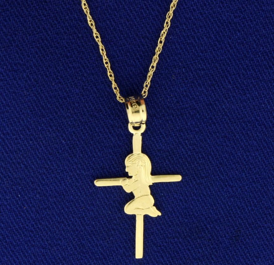 In 14k yellow gold, contains a 1 inch long pendant of a young girl praying in front of a cross. Chain is 16 inches long. 1.3g.
