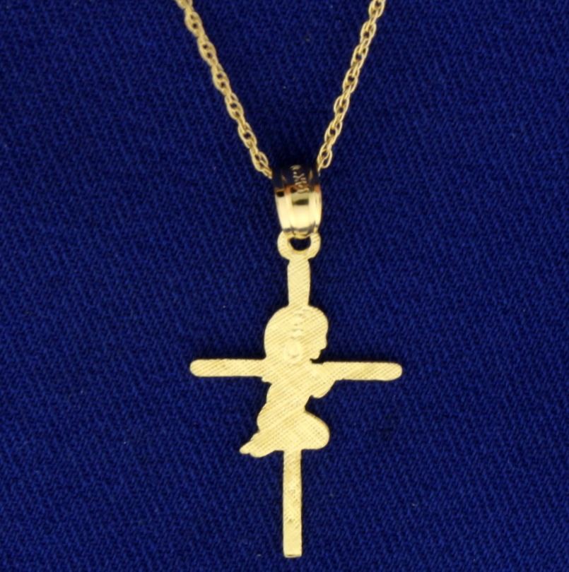 In 14k yellow gold, contains a 1 inch long pendant of a young girl praying in front of a cross. Chain is 16 inches long. 1.3g.