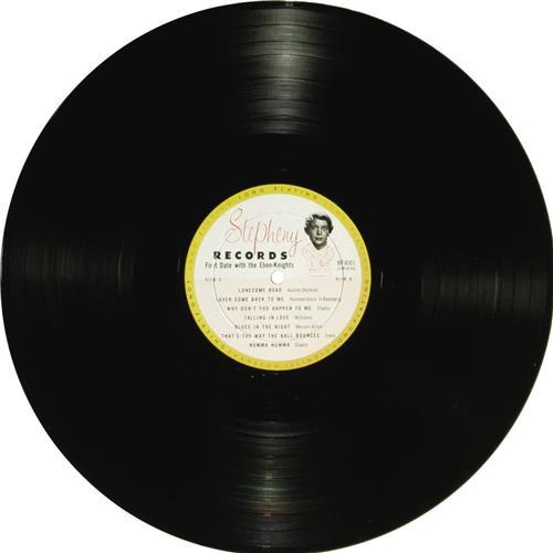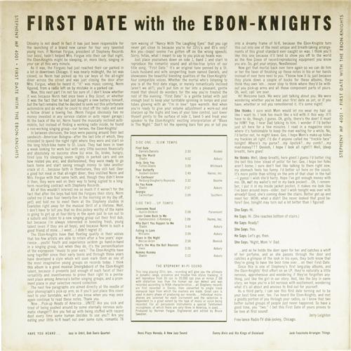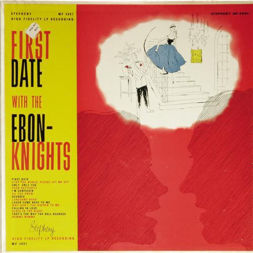 <B>"First Date With The Ebon-Knights" Mono LP Stepheny 4001 (1959).</B></I> This might be the best vocal group you've never heard of. The only album for this St. Louis group showcased their flexibility with part '40s, part spiritual, part '50s doo-wop, and nod to smooth groups like the Platters. A super copy of a super rare record! The cover has some staining around the edges and a spine split along the top. Condition: VG-EX 6 (cover)/ MT 9 (record). <I>From the GRT Collection</B></I>