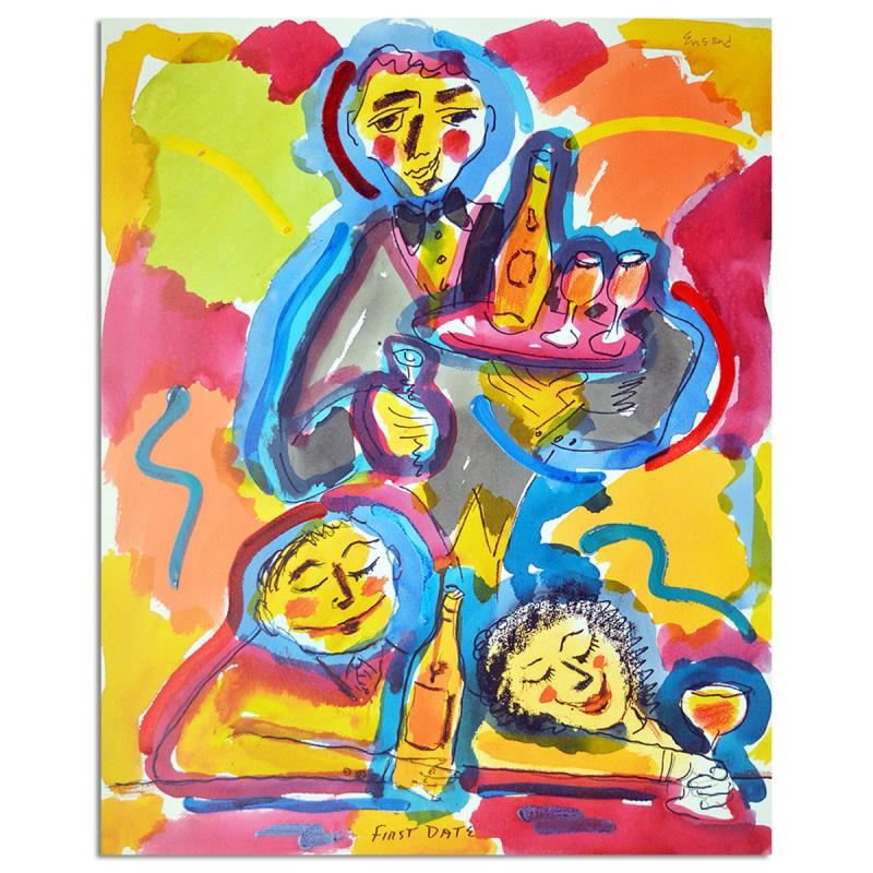 "First Date" is an original Mixed Media on Paper by Wayne Ensrud. The piece is hand signed by the artist and comes with a Certificate of Authenticity. Measures approximately 24" x 19.75".