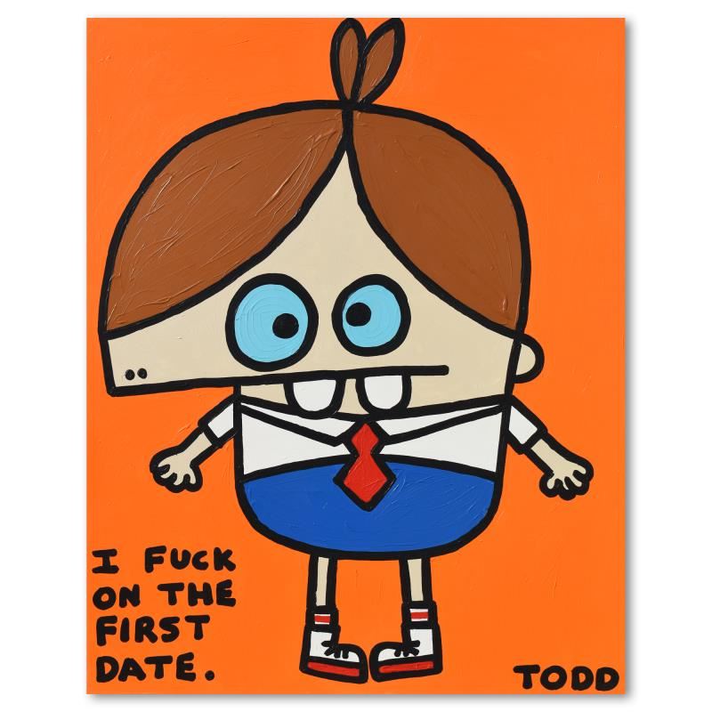 We acquired this piece as part of a larger collection. We do not approve of its inappropriate content. "First Date" is an original acrylic painting on canvas by Todd Goldman, hand signed by the artist. Includes Letter of Authenticity. Measures approx. 48" x 60" (image). Due to the way this piece was stored there may be minor wear or signs of age (such as wear on the corners) but the piece is in overall good condition.