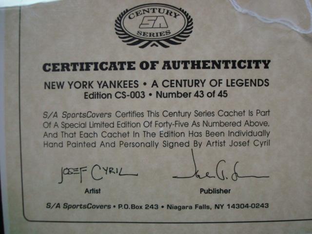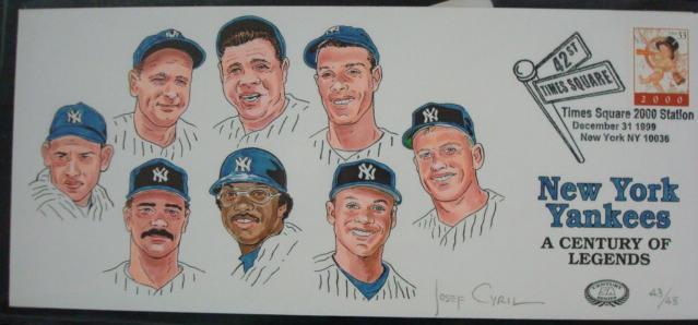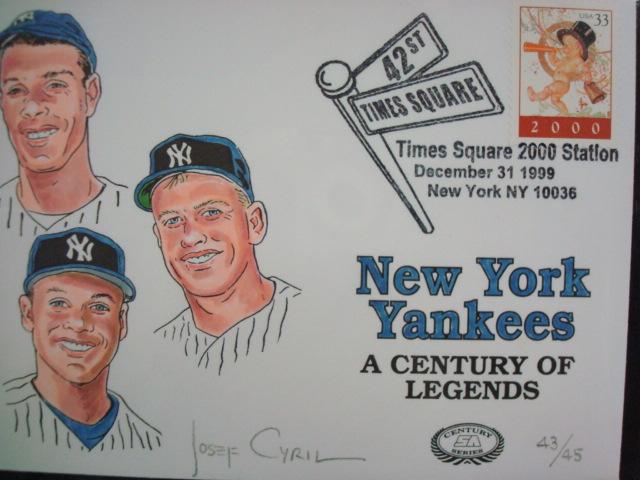 First Day Cover YANKEES CENTURY OF LEGENDS Dec 31 1999 Hand Painted and Hand Signed Limited Edition by Josef Cyril, Postmarked at Times Square 2000 Station for New York Yankees A Century of Legends By SportsCovers with Certificate of Authenticity 43/45 Edition CS-003. (30-60)