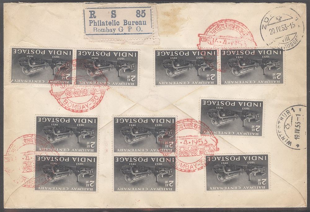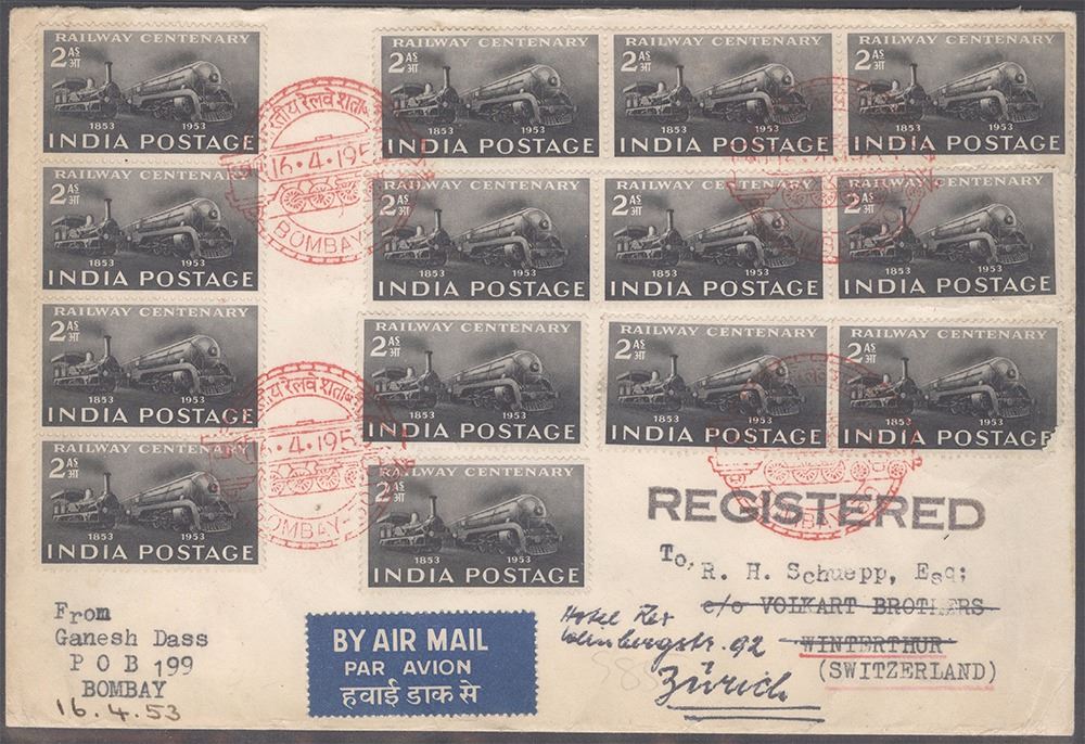 F.D.C., 1953, Railway Centenary,Cancelled with Redofficial cachet Seal, 14 + 10 Stamps on Front and back 2as x 24, 3 Rupees high value postage Stamps fixed on cover, Addressed to Zurich, Switzerland by Air Mail, Excellent Condition, Rare.