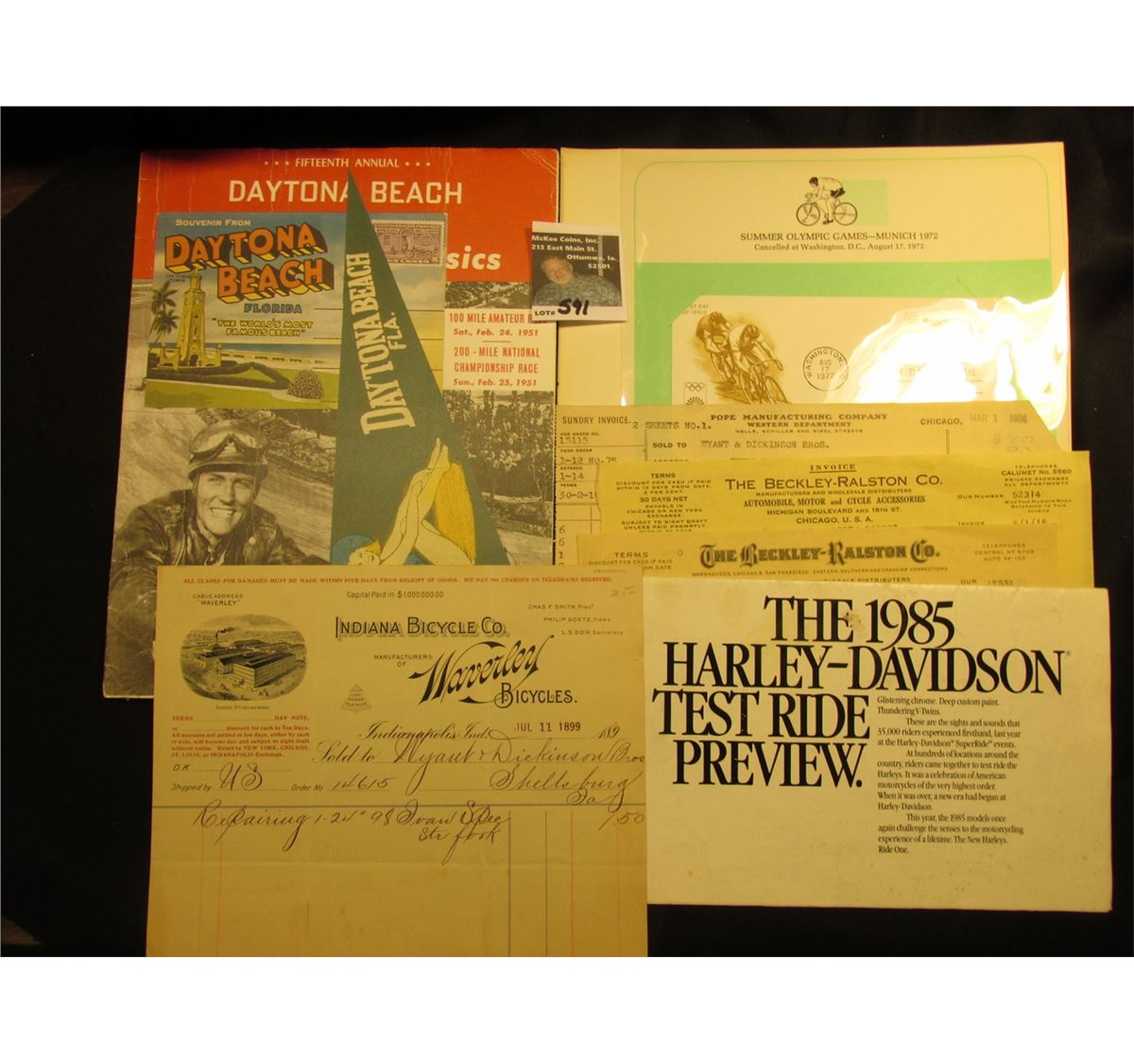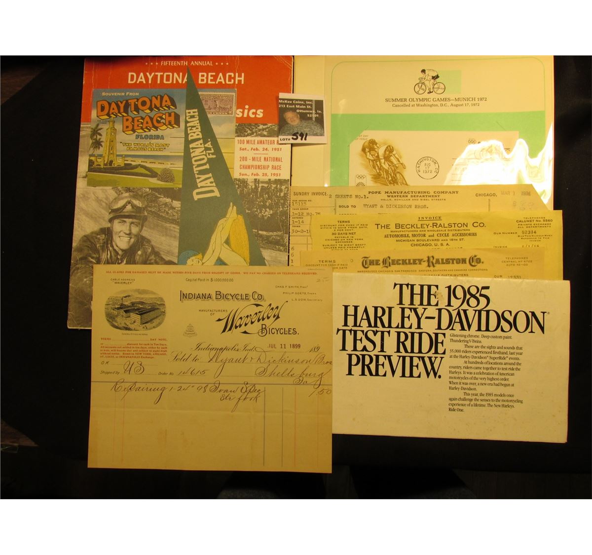 "First Day of Issue Olympic Summer Games XX Olypiad Munich 1972" Cover; Invoice Jul 11 1899 "Indiana Bicycle Co. Manufacturers of Waverley Bicycles…Indianapolis, Indiana"; "Fifteenth Annual Daytona Beach" giant Post card from Duffey Cycles; brochure "The 1985 Harley-Davidson Test Ride Preview"; (2) 1913 & 1918 Invoices "The Beckley-Ralston Co. Manufacturers and Wholesale Distributors Automobile, Motor and Cycle Accessories...Chicago"; & Mar 1 1904 "Pope Manufacturing Company Western Department".