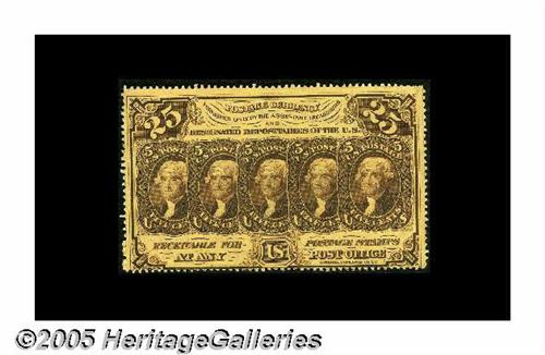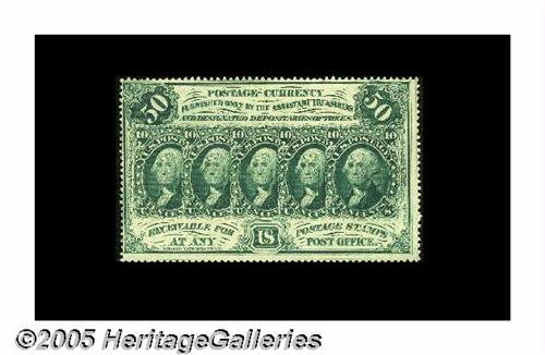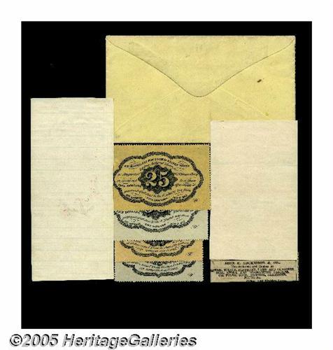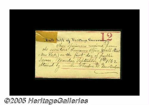 <B>First Day of Issue Set.</B></I> Tom O'Mara acquired this irreplaceable set as lot 183 of our January 1994 sale of the Wayne Liechty Collection, where it was described, "The eight pieces in this lot represent to us what collecting is all about. This is the ultimate interest item to a Fractional Currency Collector. First, clipped from a N.Y. newspaper (most likely <I>The Times</B></I>) is Assistant Treasurer John J. Cisco's September 8, 1862 announcement that Postage Currency will be distributed at his office beginning that day. There are two other clippings, one from the <I>Journal of Commerce</B></I> and one from the <I>New York Times,</B></I> both dated September 10, 1862. Both are reports on the chaos and humor of a small-change-hungry city, desperate for the new currency. The crowning item is a handwritten envelope containing a 'full sett (sic) of Postage Currency,' and inscribed, 'These specimens received from the assistant treasurer's office, (Wall Street, New York) on the first day of Public Issue, Monday September 8th 1862 obtained by -- Theodore W. Van Norden.' In the envelope are four fully perforated examples of Postage Currency; Fr. 1228 Superb Gem New, Fr. 1242 10¢ Superb Gem New, Fr. 1279 25¢ Gem New, a bit tight at the bottom and Fr. 1310 50¢ Gem New, a bit close at the top and left. All four have deep, even perforations and perfect original color." To this cataloger, this set is one of the most evocative Fractional items and would be a major highlight in any collection it entered.