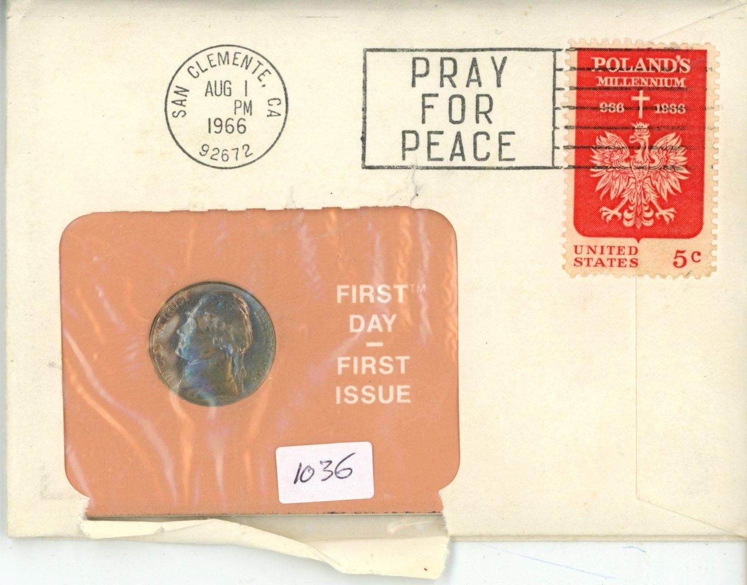 First Day of Issue Stamp and Coin Set issued with a U.S. 5 cents stamp depicting Poland’s Millennium and an American Jefferson Nickel. Issued in 1966.