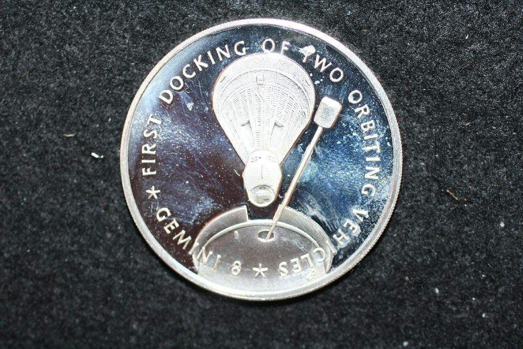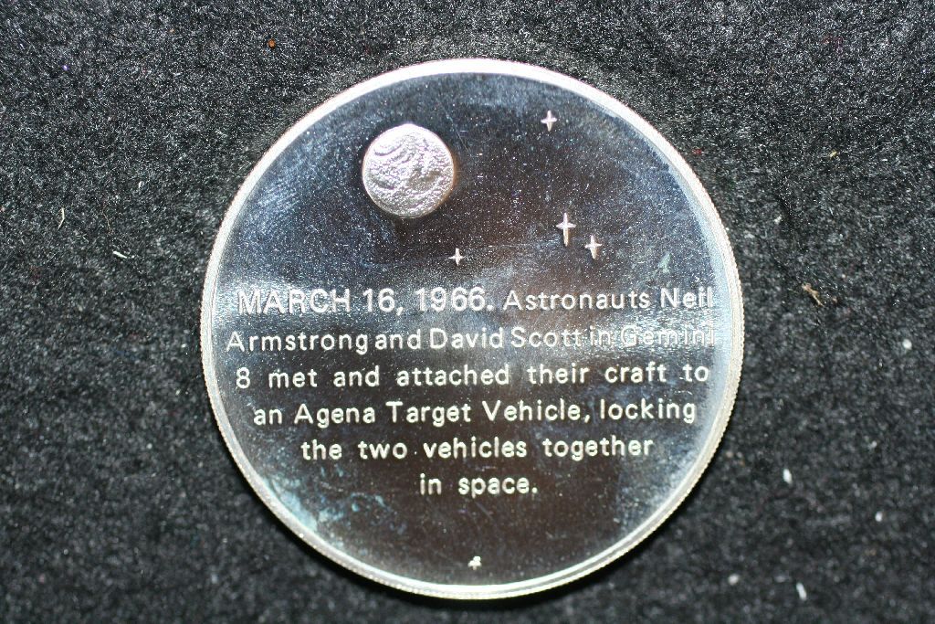 First Docking of Two Orbiting Vehicles Sterling Round; Gemini 8 piloted by Neil Armstrong & David Scott met & attached their craft to an Agena Target Vehicle locking the 2 vehicles in space; Sterling Silver 1 Oz.
