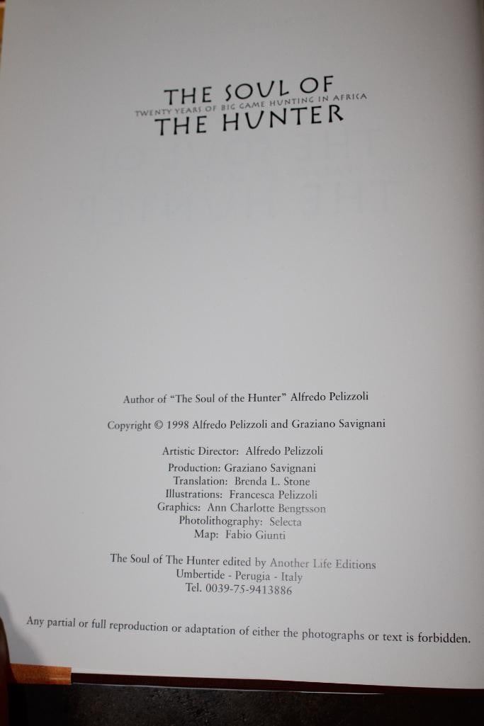 First Edition 1998 "The Soul of the Hunter" Signed "Nairobi 2001 Alfredo Pelizzoli". COLLECTIBLE AFRICAN HUNTING BOOKS?