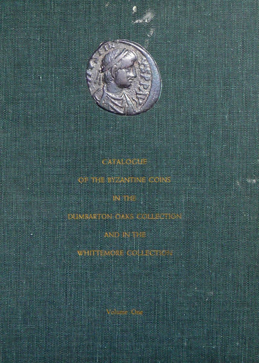 Bellinger, Alfred R., and Philip Grierson [editors]. CATALOGUE OF THE BYZANTINE COINS IN THE DUMBARTON OAKS COLLECTION AND IN THE WHITTEMORE COLLECTION. VOLUME ONE: ANASTASIUS I TO MAURICE, 491-602. BY ALFRED R. BELLINGER. VOLUME TWO: PHOCAS TO THEODOSIUS III, 602-717. BY PHILIP GRIERSON. VOLUME THREE: LEO III TO NICEPHORUS, 717-1081. BY PHILIP GRIERSON. Washington, D.C.: Dumbarton Oaks Research Library and Collection, 1966-73. First editions. 4to, original green cloth, gilt. xxvi, 383, (1); viii, (2), 383, (1); (10), 385-728; ix, (1), 470; viii, (2), (473)-887, (1) pages; tables; 80 + 46 + 70 fine plates of coins. A moderately used set, generally near fine. [with] Hendy, Michael F. COINAGE AND MONEY IN THE BYZANTINE EMPIRE, 1081-1261. Washington, D.C.: Dumbarton Oaks Studies XII, 1969. 4to, original green cloth, gilt. xviii, (2), 453, (3) pages; tables; 2 folding maps; 51 fine plates. Near fine. First editions, with superior plates, of the first three volumes of this indispensable, standard reference work. Clain-Stefanelli 5392*. Grierson 110. The Hendy work is Clain-Stefanelli 5399*. Grierson 110.