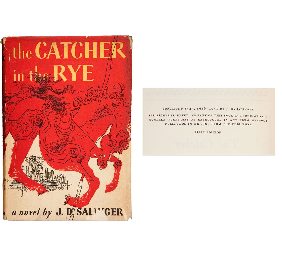 First edition, first printing of J.D. Salinger's ''The Catcher in the Rye.'' Boston: Little Brown and Company: 1951. Present with first issue dustjacket showing $3.00 on front flap and Salinger's photo on rear jacket panel. Excellent copy of the coming-of-age literary masterpiece featuring Holden Caulfield, the poster boy of disenfranchised youth. Runs 277pp. and measures 5.5'' x 8''. In publisher's black cloth with gilt titles to spine. Book is in very good condition with binding very slightly cocked, light bumping to ends, bookplate to front pastedown and faint foxing to all page edges. Dustjacket is in good condition with tape repairs to verso, minor chips at edges of folds, and a darkened spine. Overall a handsome copy of one of the most acclaimed works of 20th century literature.