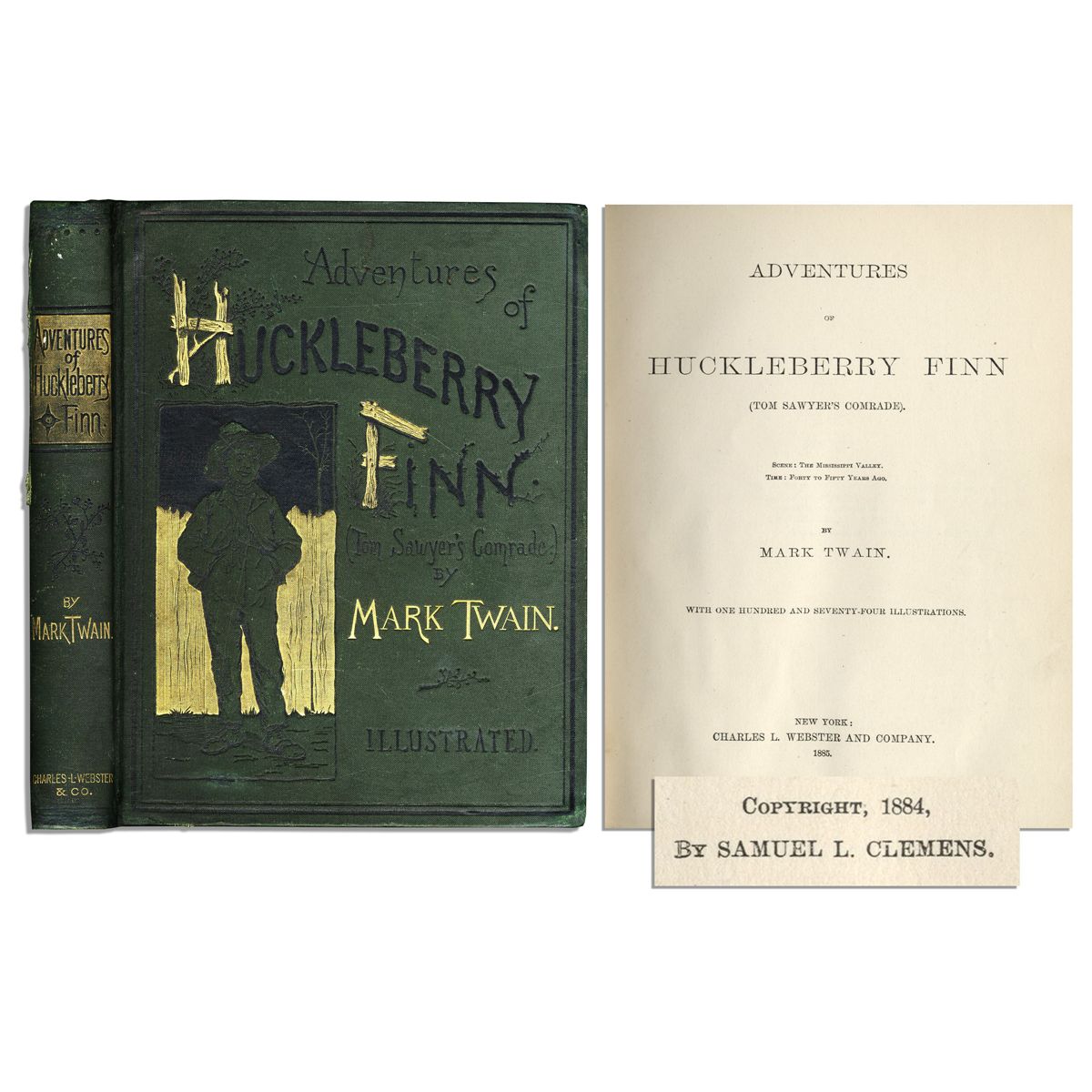 First edition, first printing of ''Adventures of Huckleberry Finn (Tom Sawyer's Comrade)'' by Mark Twain with illustrations by E.W. Kimble. Charles L. Webster and Company: New York: 1885. First edition, first printing of the beloved classic that became the wellspring of American literary fiction. Hemingway once said of it, ''All modern American literature comes from just one book by Mark Twain called 'Huckleberry Finn.''' All first issue points present including: (1) heading for chapter 6 reads ''decided'' (later corrected to ''decides'') on page 9; (2) ''Him and another man'' listed incorrectly with ''88'' on page 13; (3) page 57, 11 lines from bottom, reads ''with the was''; (4) tablecloth under the bust of Twain at frontis is visible and ''Heliotype Printing Co.'' imprint is present; (5) on page 155, the second ''5'' is in a different font; (6) final leaf is blank; (7) title page is a cancel. In publisher's full green pictorial cloth, stamped and lettered in gilt and black. The 366pp. novel measures 7'' x 8.5''. Some fabric loss to backstrip, the edges of which have been restored. Very light toning to pages and prior owner's name on front free endpaper. Overall a very bright, very good to near fine copy of this landmark novel.