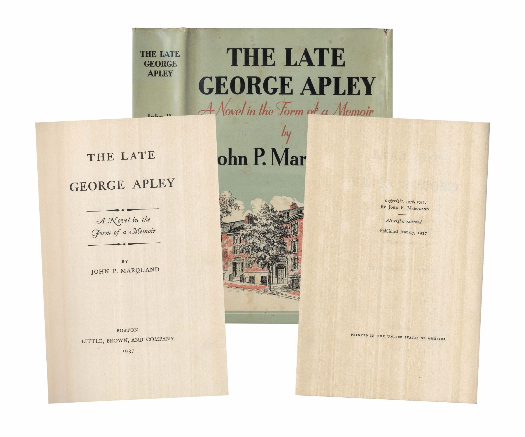 First edition, first printing of ''The Late George Apley'', for which the author John Marquand won the Pulitzer Price for Fiction in 1938. The novel -- told in the form of a memoir by the eponymous wealthy Boston patriarch -- was also adapted into a play, feature film and television series. Boston: Little, Brown, and Company, 1937, with ''Lovely Pearl'' on page 19 as required for the first printing and with the $2.50 price intact. Bound in blue cloth boards with gilt lettering and top edge stained red. Book and dust jacket are in unusually nice condition; jacket has minor foxing and small chip, otherwise near fine. Book has discreet owner's name (front) and short inscription (verso) on free front endpaper, and vertical streaking to paper stock found in all copies, else near fine.