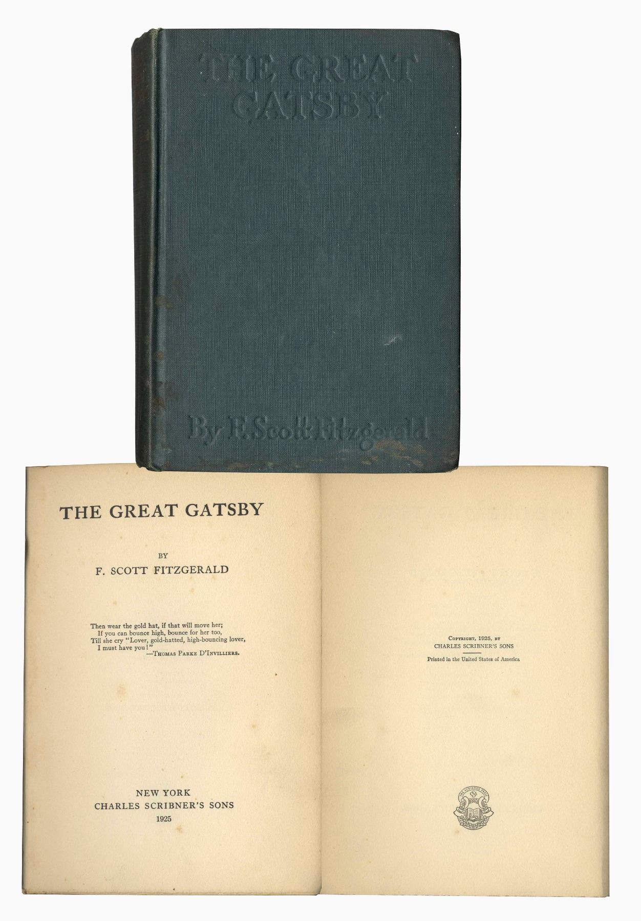 Rare first edition, first printing of F. Scott Fitzgerald's masterpiece ''The Great Gatsby''. With all first printing points present, including typographical errors on pages 60, 119, 165, 205 and 211. New York, Charles Scribner's Sons: 1925 with no additional edition markings to title or copyright pages. Runs 218pp., bound in teal cloth boards with the title and author lightly embossed to cover, and the title, author and publisher written in gilt on spine. Measures 5.5'' x 7.75''. Light cocking to spine, small amount of dampstaining, mostly to top edge and previous owner's name on front free endpaper. Overall an attractive copy in very good condition.