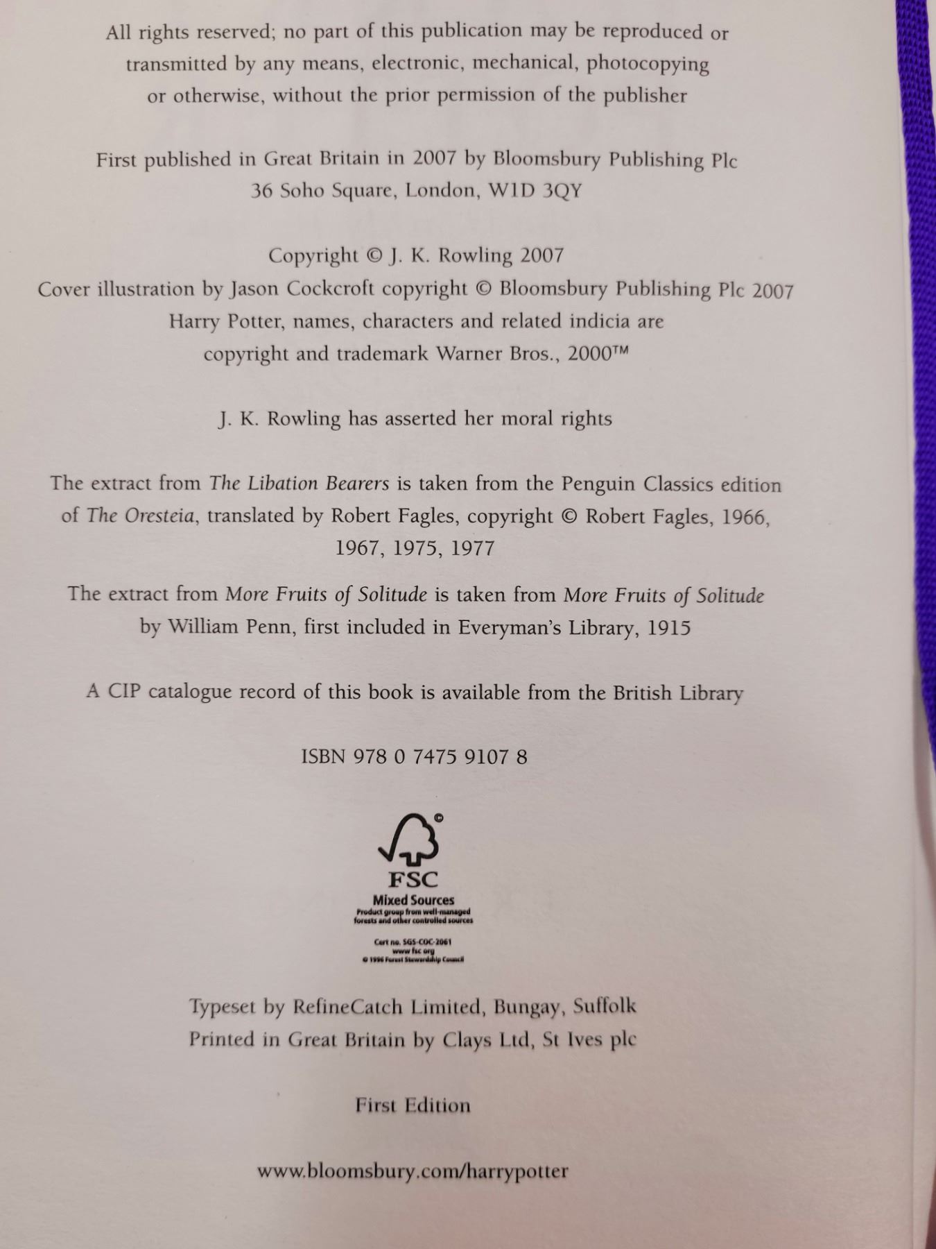 First Edition Harry Potter And The Deathly Hallow Hard Cover Book By J.K.Rowling