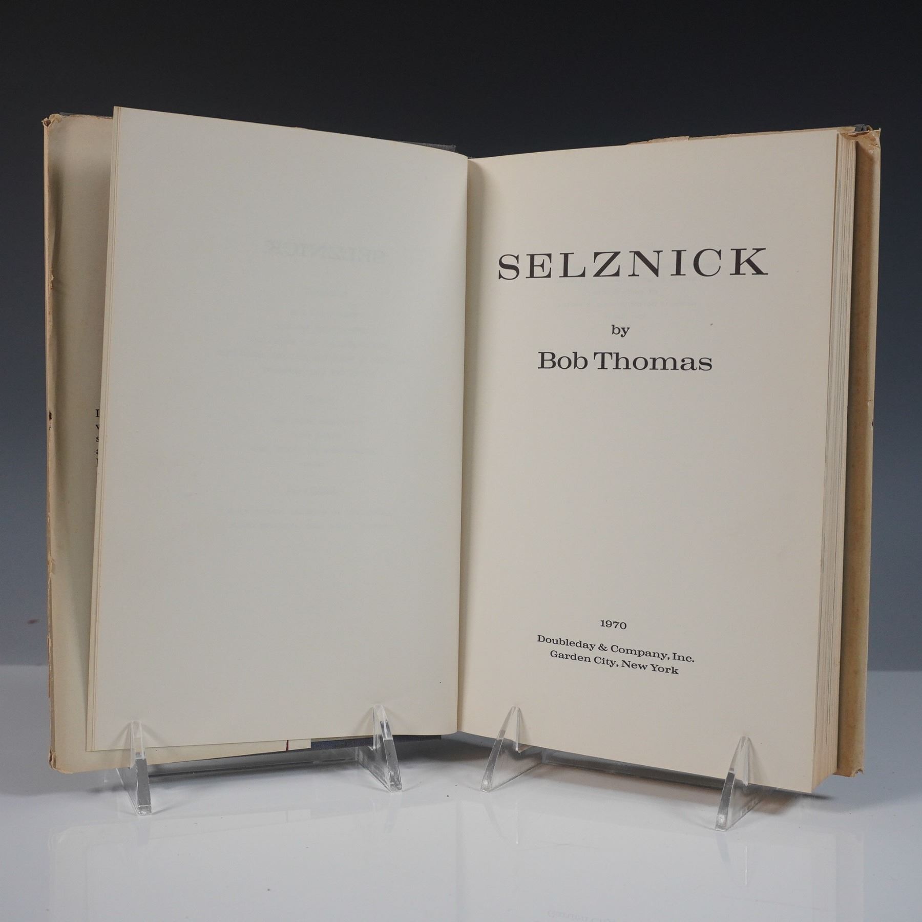 A first edition hardcover copy of Selznick by Bob Thomas, published in 1970 by Doubleday & Company. This biography explores the life and career of legendary Hollywood producer David O. Selznick, known for Gone with the Wind and Rebecca. The book features its original dust jacket with a black and white author photograph on the back. The copyright page confirms this as a first edition.