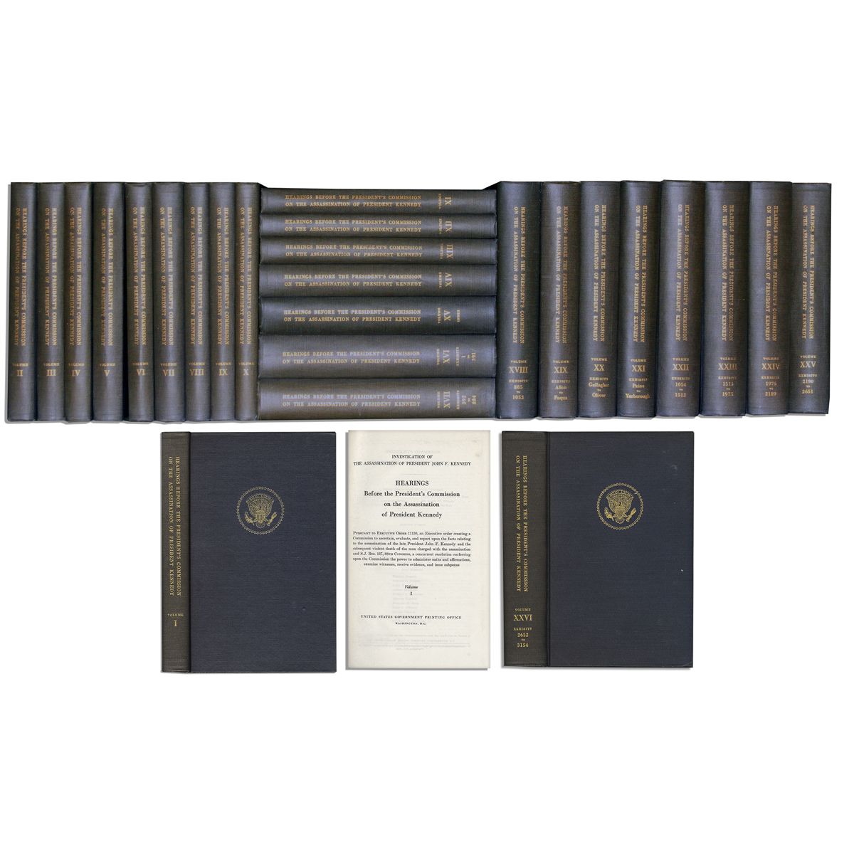 First edition collection of the ''Hearings Before the President's Commission on the Assassination of President Kennedy'', Washington, DC: United States Government Printing Office: 1964. Includes all 26 volumes, excluding the ''Report'' summary volume. Each volume measures 6.5'' x 9.5''. Set is in near fine condition overall, with minimal toning to leaves and the very slightest sunning to spines. An increasingly hard to find set from this controversial hearing.