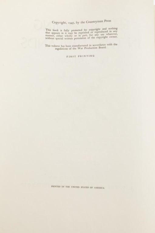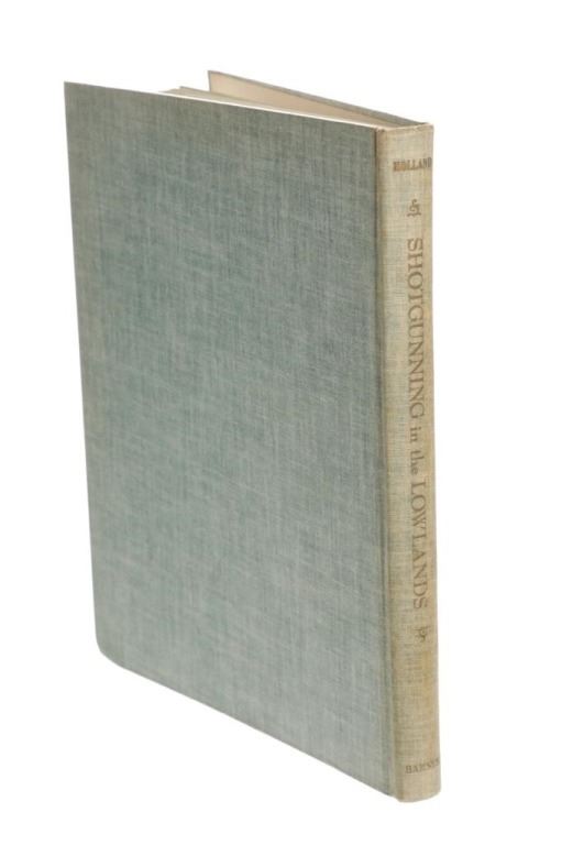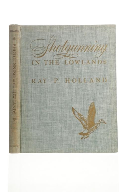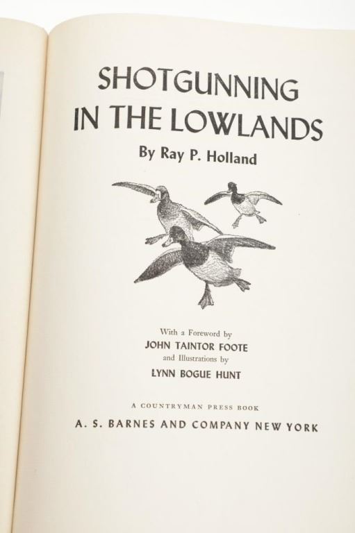 For your consideration is the First Edition book, "Shotgunning in the Lowlands", by Ray P. Holland, foreword by John Taintor Foote, illustrated by Lynn Bogue Hunt with 9 color plates. "This is more than a nostalgic record of years of duck (and goose) shooting the country over. It is, in addition, a practical how-to-do-it book, in the tradition of the other excellent books projected by Penn Publishing executed by The Countryman Press. The hows and whys of one kind of shooting or another, kinds of blinds and how to construct (this from experience and observation), placing of decoys (this by anecdote), guns and dogs and duck calls, the knowhows that make the difference between a good shot and a poor, a good sportsman and a poor one. A natural for that sporting book market that is starved for good material as well as opportunity to ply their hobby".