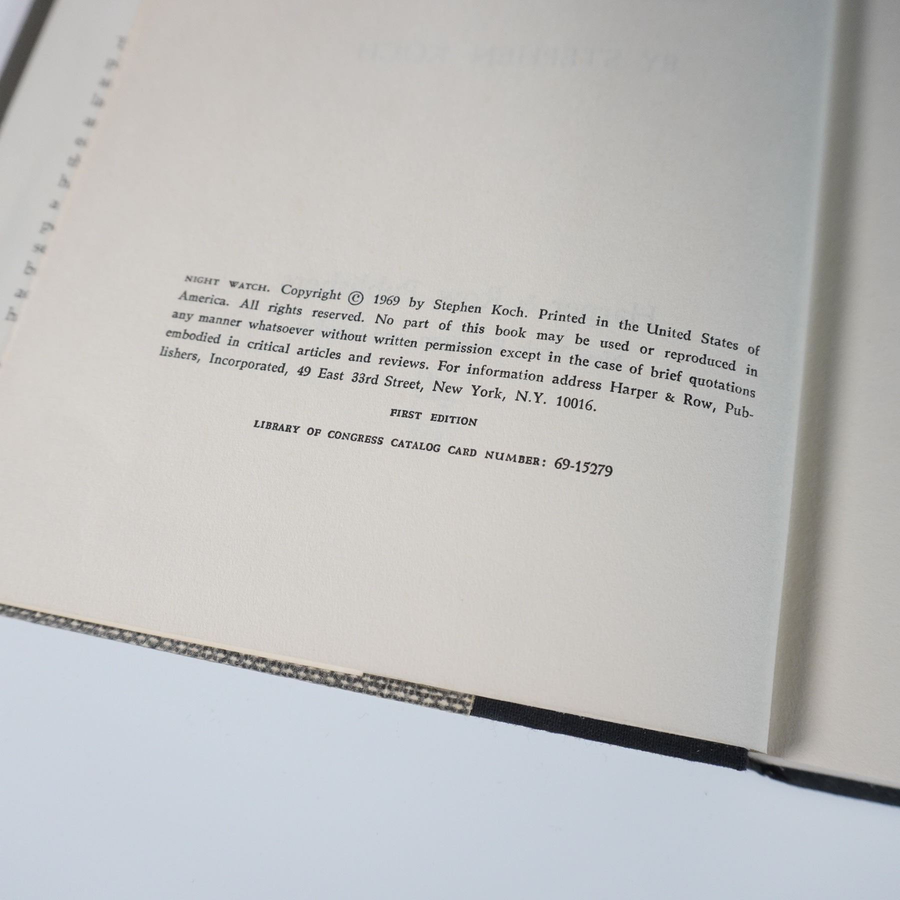 New York: Harper & Row, 1969. First edition of Stephen Koch's novel Night Watch, featuring a dramatic dust jacket design. The book explores psychological and existential themes through its narrative. Hardcover with original dust jacket, 212 pages.