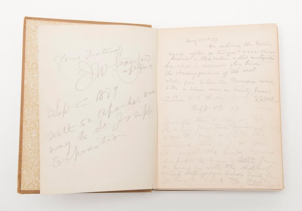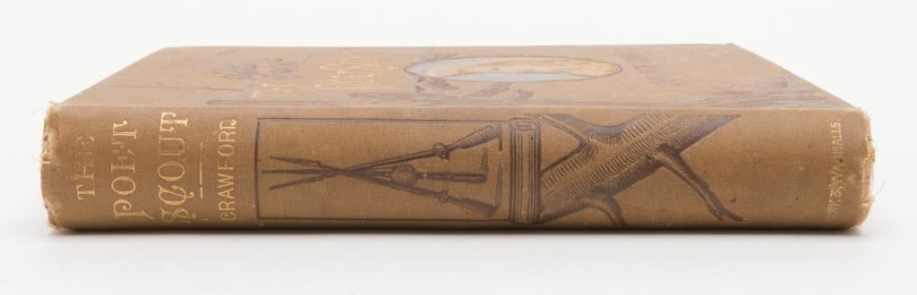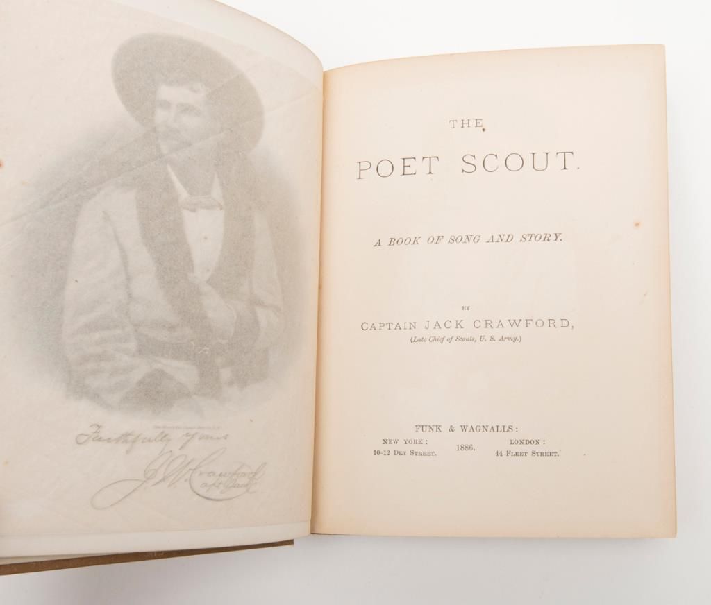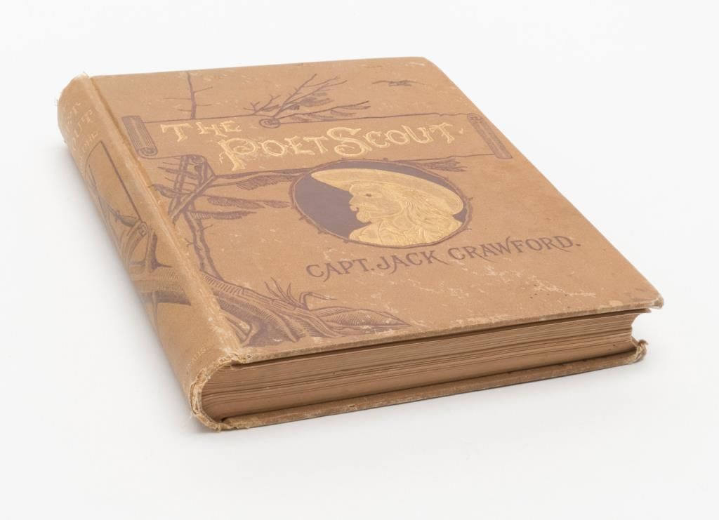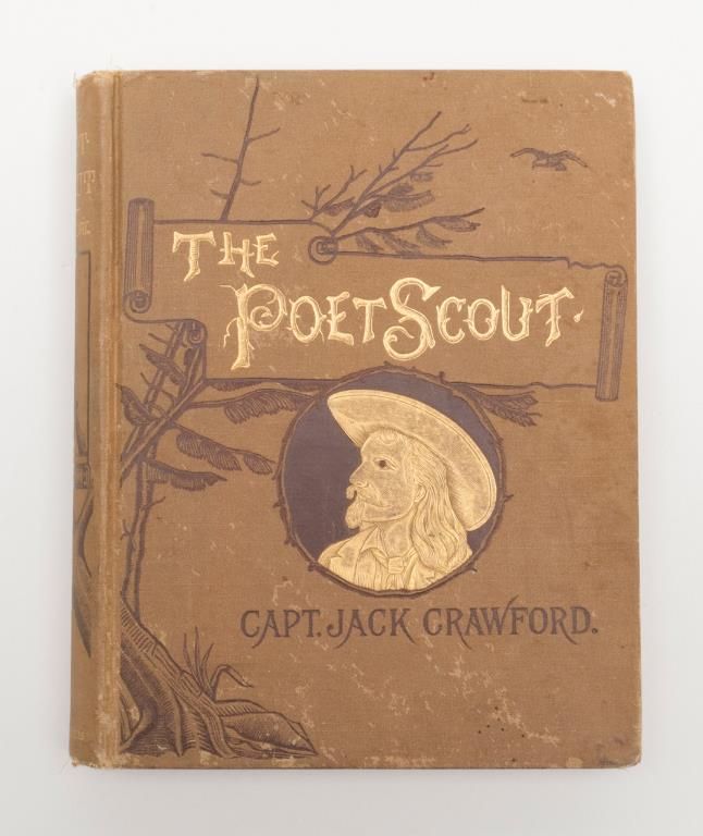 First Edition hardback of The Poet Scout by Capt. Jack Crawford (1886) with handwritten personal notes on inside first pages: “Yours Fraternaly (sp) J. W. Crawford aka Jack, Sept 2nd 1889 with 50 Apaches on way to St Joseph Exposition”; also: “Aug 15th 89 On entering the Raton range after a ____ rain storm, inscribed in this volume without authority (?) See what a crimson glory binds the shadowy forehead of its west. While far below the Canadian winds, like a blue vein onbounty (?) breast”. (Signed with initials). “To Com L. C. ____ Sept. 2nd 89 I was after this a day or two The Major found those buried guns. He wore the gray and I the blue. Survived him & I & for Amongst the lucky ones and just to have alittle fun to mix in with the short while Albuquerque holds each gun I’ll try to hold ‘The Fort’. J.W.C.”. Overall, the book is in good to very good condition with some slight fraying to the top and bottom of the spine and corners of the cover and some losses to end pages but good interior pages that show minimal aging. As noted in the previous lot, Captain John Wallace Crawford was known as Captain Jack the Poet Scout and led an interesting life on the frontier having