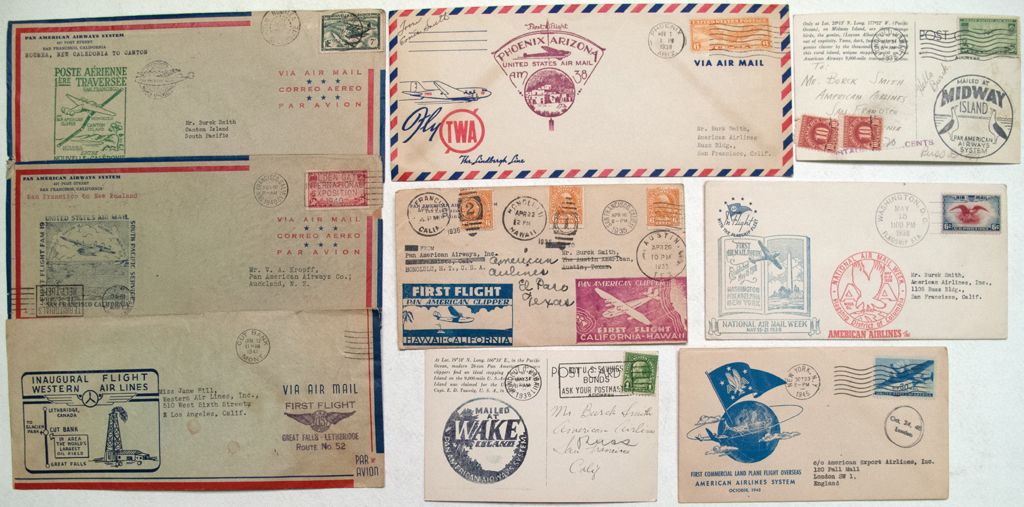 Lot of 9 covers and cards. Included are: 1) Hawaii to California, 1935, on a Pan American Clipper, cover addressed to Burck Smith; 2) RPC mailed at Wake Island to Burck Smith in San Francisco, 1938; 3) First Flight, Phoenix, Arizona, 1938, to Burck Smith from Ernie Smith; 4) RPC mailed at Midway Island, Pan American Airways, 1938, to Burck Smith; 5) Cover and letter to Burck Smith dated 1938 from and regarding the Flagship District of Columbia commemorating the 20th anniversary of air mail service; 6) Pan American Airways cover from Noumea, New Caledonia to Canton Island, 1940; 7) First flight cover from Lethbridge, Canada to Cut Bank, Mont., 1941; 8) Pan American Airways first flight cover from San Francisco to New Zealand, 1940; 9) American Airlines first flight cover—first commercial land plane flight overseas, October 1945. From the American Industrialist Collection.