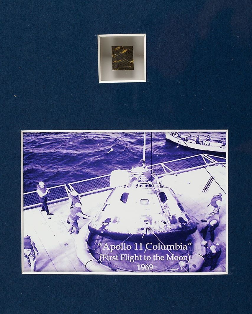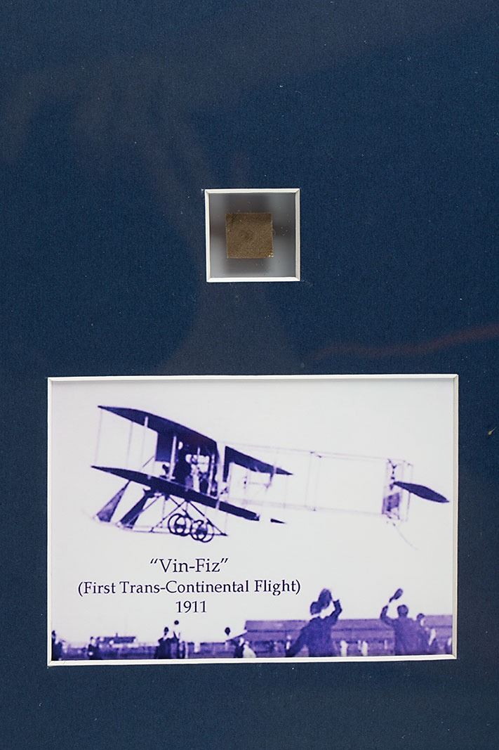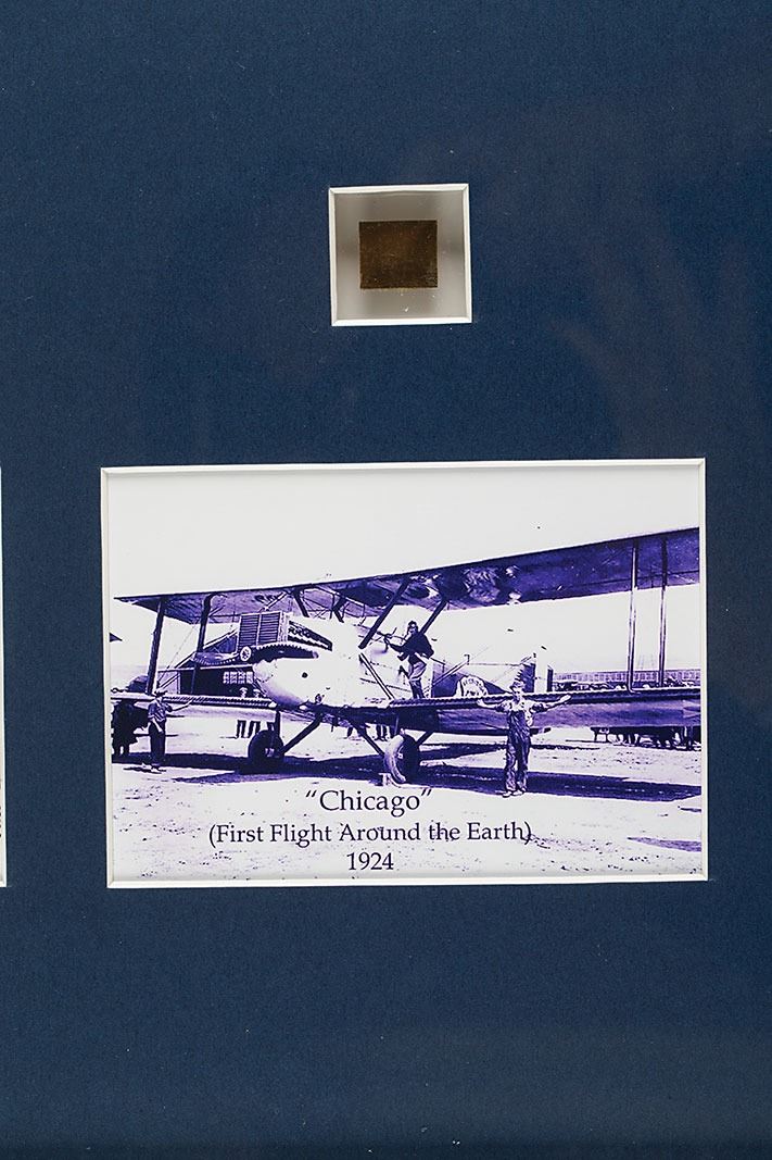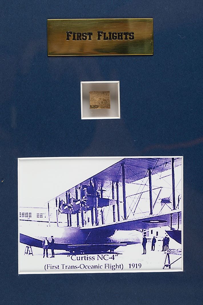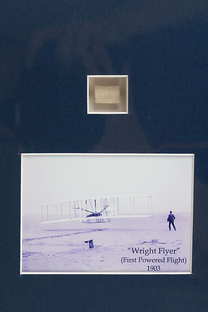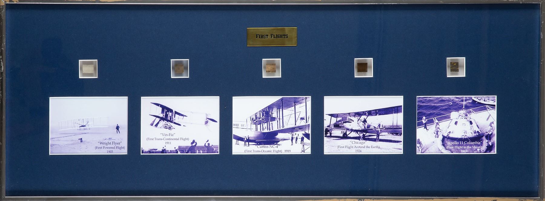 Extraordinary limited edition "First Flights" relic display, numbered 6/12, containing flown swatches from the Wright Flyer (first powered flight, 1903), Vin Fiz (first transcontinental flight, 1911), Curtiss NC-4 (first transoceanic flight, 1919), Douglas World Cruiser Chicago (first circumnavigation of the world, 1924), and Apollo 11 Command Module Columbia (first lunar landing, 1969). The Wright Flyer swatch was acquired from NASA Production Control Engineer Bill Whipkey, who created many displays and presentation pieces for the astronauts; the larger swatch that this fragment originates from is believed to have been carried on Apollo 11 by Neil Armstrong. The Vin Fiz, Curtiss NC-4, and Chicago swatches originate from Smithsonian presentations prepared with material recovered during restoration at the National Air and Space Museum. The Apollo 11 swatch is a piece of flown Kapton foil recovered from the Apollo 11 CM Columbia's thermal protection subsystem, supplied by aerospace memorabilia specialist Ken Havekotte. The display, created by collector Noah Bradley, is framed to an overall size of 31.5 x 11.25. In fine condition. Accompanied by a substantial packet of provenance information, which can be viewed at RRAuction.com.