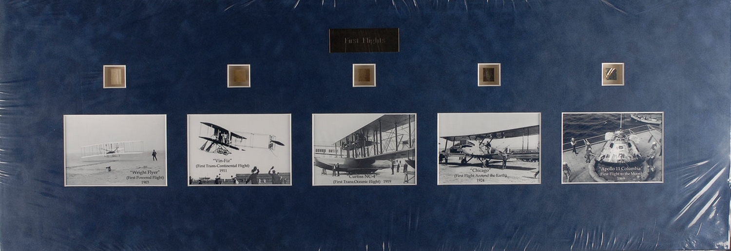 Very interesting collection of five pieces of materials from the air and spacecraft which made historic first flights, with each piece of material measuring approximately .5 x .5. Pieces are from the Wright Flyer (first powered flight), Vin-Fiz (first flight across a continent), Curtiss NC-4 (first flight across an ocean), Chicago (first flight around the world), and a piece of skin from Apollo 11’s capsule Columbia (first landing on the moon). All are suede matted together with photos of the respective crafts, to an overall size of 32 x 11.