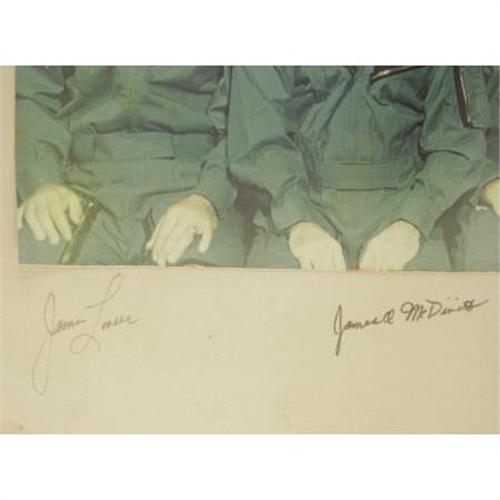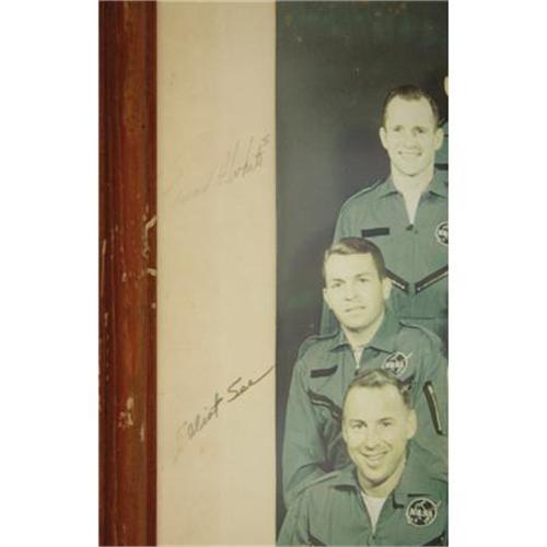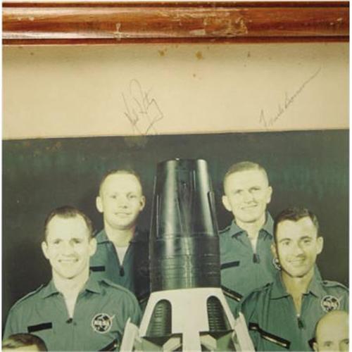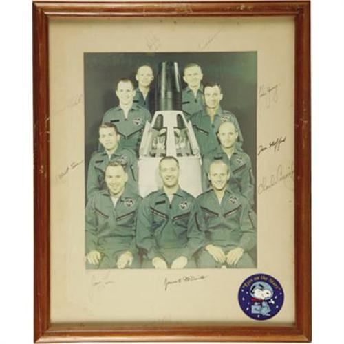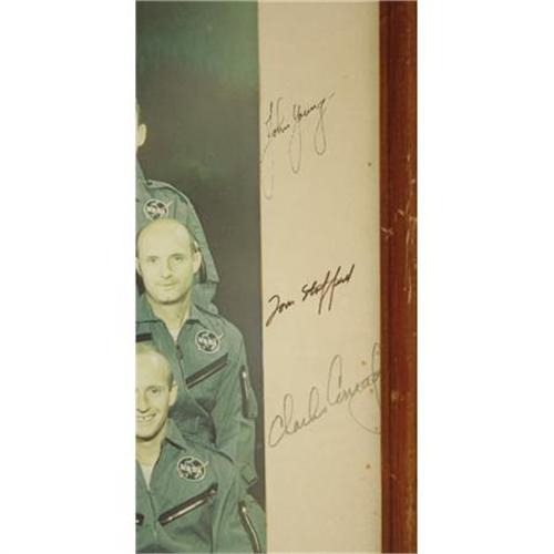 <B>First Gemini Astronauts Large Signed Color Photograph,</B></I> 11" x 13.75", matted to 15.5" x 19.25". Picturing a model of the Gemini capsule, signed on the mat: "<I>Neil Armstrong,</B></I>" "<I>Frank Borman,</B></I>" "<I>John Young,</B></I>" "<I>Tom Stafford,</B></I>" "<I>Charles Conrad Jr.,</B></I>" "<I>James A McDivitt,</B></I>" "<I>James Lovell,</B></I>" "<I>Elliot See,</B></I>" and "<I>Edward H. White II.</B></I>" On September 17, 1962, at NASA headquarters in Houston, these nine men were introduced as new astronauts, the first to be chosen since the original Mercury astronauts were named in 1959. The photo has faded a bit and the mat is foxed and soiled at the left edge, affecting the signatures of See and White. Selected as the command pilot for the Gemini 9 flight, Elliot See was killed on February 28, 1966, in St. Louis, Missouri, in the crash of a T-38 aircraft, three months before his scheduled flight. Pilot of Gemini 4 (1965) and the first American to walk in space, Edward H. White II was named as one of the pilots of the first 3-man Apollo flight. He was killed on January 27, 1967, in the Apollo 1 spacecraft flash fire during a launch pad test at the Kennedy Space Center in Florida. A Snoopy "Eyes on the Stars" sticker has been affixed at the lower right. Perhaps the scarcest signed astronaut group photograph in existence, and the first we've ever seen, this signed image is rarer than the highly sought after Project Mercury group photo. The nine astronauts signed this photograph for Joe Garino while training at the physical conditioning lab. Armstrong (Apollo 11), Conrad (Apollo 12), and Young (Apollo 16) later walked on the moon. Framed to 17.5" x 21.75". <I>From the collection of renowned former physical trainer of the astronauts Joe Garino. This lot is accompanied by a signed certificate of authentication from Garino verifying its provenance.</B></I><BR><BR><b>Shipping:</b> Framed - with Glass, Medium (<a target="_blank" href="http://www.heritageauctions.com/common/shipping.php">view shipping information</a>)