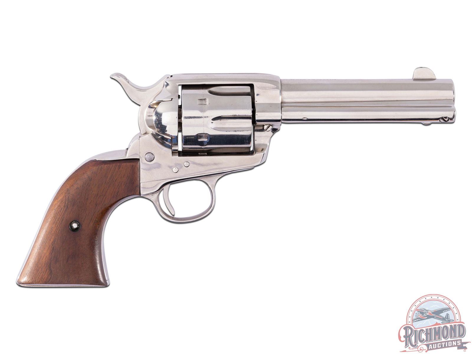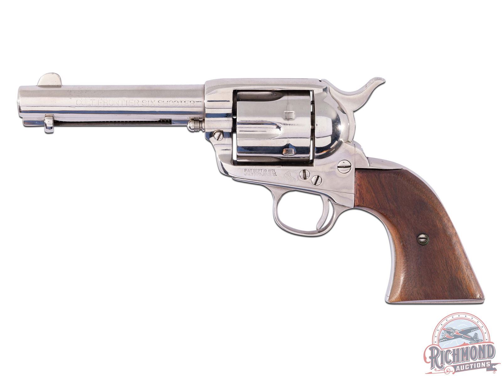 Manufactured in 1906, a first generation single action army in the smokeless powder frame. Features a 4-3/4" "gunfighter" barrel with integrated rear notch sight and blade front sight. Top of the barrel is stamped with the two-line Colt address, and left side is stamped "COLT FRONTIER SIX SHOOTER". Nickel finish with a six round fluted cylinder. Bottom of the receiver is stamped with serial number "283074", while the frame is stamped "232544". Fitted with smooth walnut wood grips. CALIBER: 44-40 WIN. S/N: 232544. FFL STATUS: Curio & Relic.