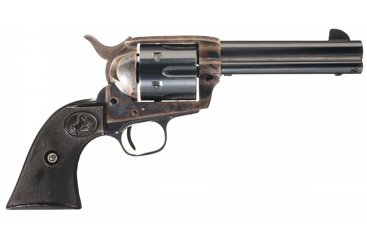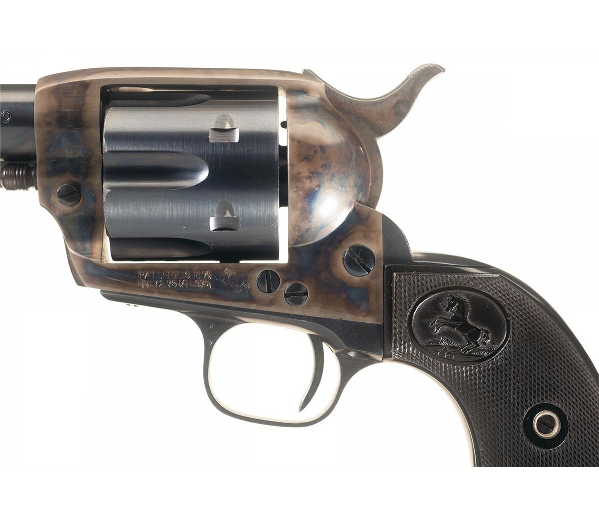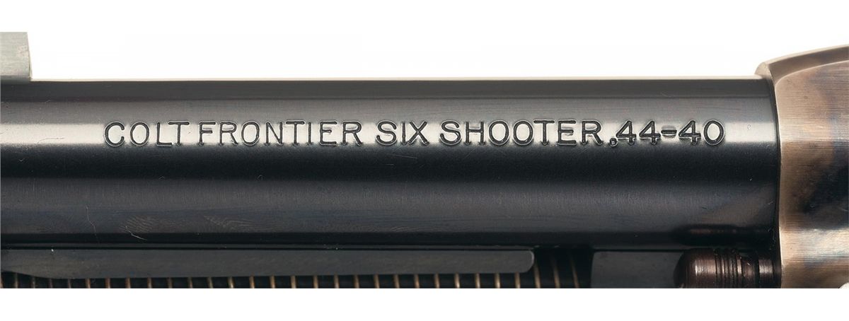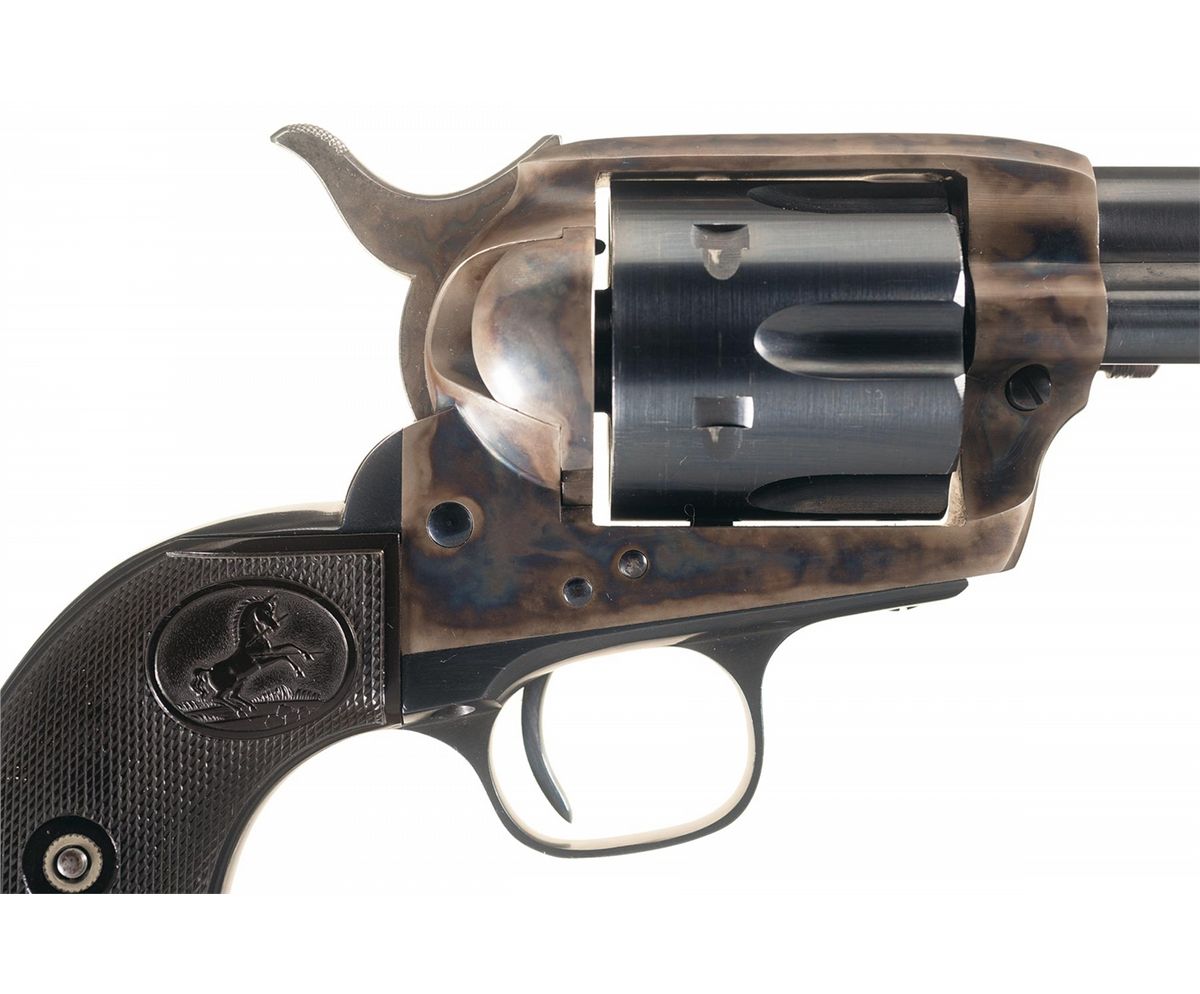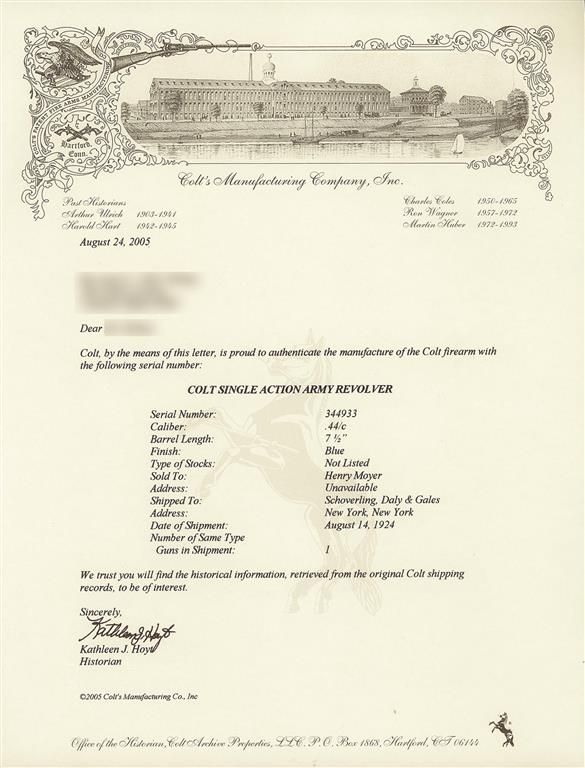 According to the included factory letter, this revolver was part of a single piece shipment to Henry Moyer, care of Schoverling, Daly & Gales of New York City on August 14, 1924, in 44/c caliber with a 7 1/2 inch barrel (now 4 3/4 inch), blue finish and "Not Listed" grips. Blade front and notch rear sights with the stamped Frontier legend on the left side of the barrel, two-line Hartford address on top, two-line patent dates on the frame next to the uncircled Rampant Colt, matching numbers on the frame, cylinder and grip straps and "605" on the frame and loading gate. Fitted with a pair of checkered grips with Rampant Colt imprints at the tops.