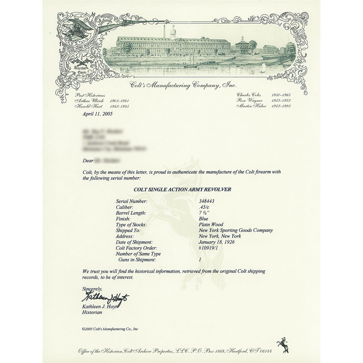 Manufactured in 1926. Replacement grips. Accompanying factory letter verifies barrel length, caliber, blue finish, "Plain Wood" grips and that it was shipped as 1 of 1 to New York Sporting Goods Company, New York, N.Y. on January 18, 1926.