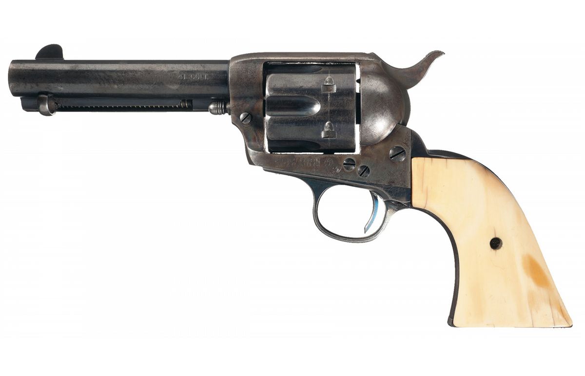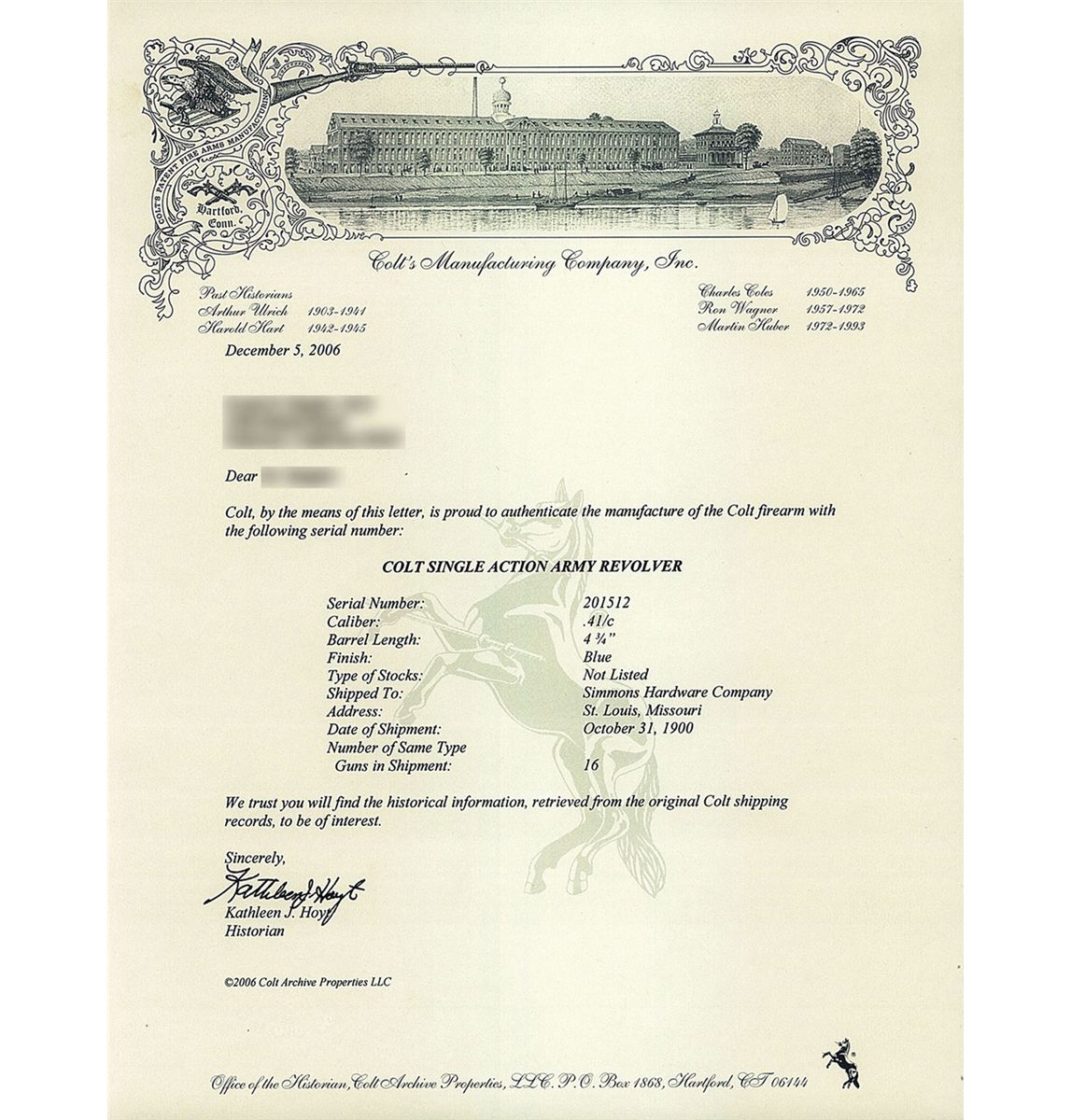 Manufactured in 1900, the accompanying factory letter verifies the serial number, caliber, barrel length, blue finish with the grips as "Not Listed" and that it was shipped as 1 of 16 to Simmons Hardware Company, St. Louis, Missouri on October 31, 1900. The top of the barrel is marked with the two line address, the left side "41 COLT", and the left side of the frame is marked with the two line, three patent dates followed by the circled Rampant Colt. Casehardened frame and hammer, blue remaining parts and fitted with smooth two-piece ivory grips.