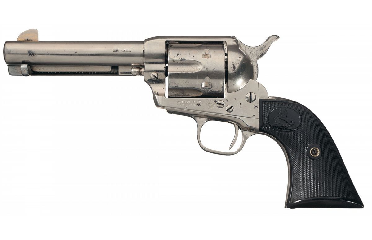 Manufactured in 1922. The top of the barrel is marked with the two line address, the left side is marked "45 COLT" and the left side of the frame is marked with the two line, three patent dates followed by the Rampant Colt. Matching serial number is marked on the bottom of the frame and on the right side of the grip straps under the grip. The matching assembly number "334" is marked on the loading gate and right rear of the frame. Blade front and frame notch rear sights, all nickel finish and fitted with checkered hard rubber grips with the Rampant Colt in an oval at the top.