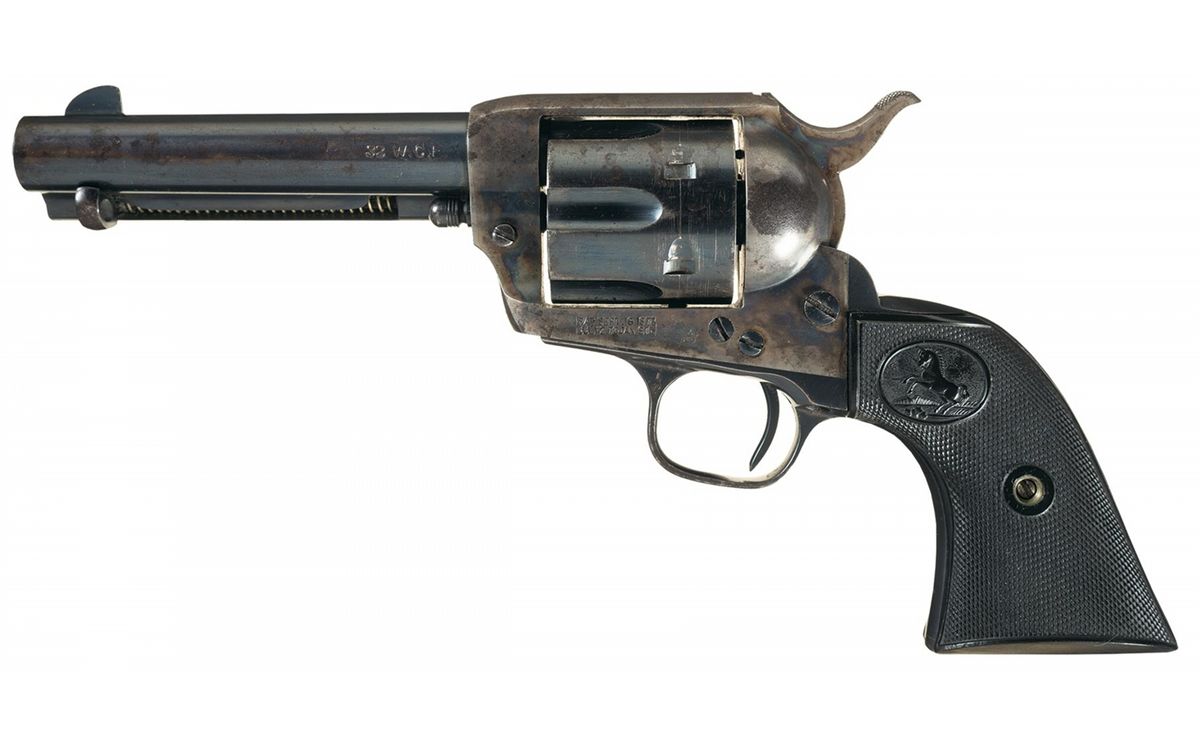 This is a nice example of a late 1920 production Colt Single Action Army revolver in the desirable 32 W.C.F. caliber. This was a fairly scarce chambering during this time as most of the Colt Single Action Army revolvers manufactured with the short 4 3/4 inch barrels were in the 45 LC and 44/40 WCF. The top of the barrel is marked with the two line address, "32 W.C.F." on the left side and the two line, three patent dates are on the left side of the frame followed by the Rampant Colt. The matching serial number is marked on the bottom of the frame, and on the left side of the front and back strap under the grip. The partial serial number "51" is marked on the rear cylinder face. The matching assembly number "22" is marked on the right rear of the frame and on the loading gate. The upper left front of the trigger guard bow has a number "1" sub inspectors mark over the Colt "VP" triangle proof. Blade front and frame notch rear sights, blue finish with casehardened hammer and frame, and fitted with replacement checkered hard rubber grips with the Rampant Colt in an oval at the top.