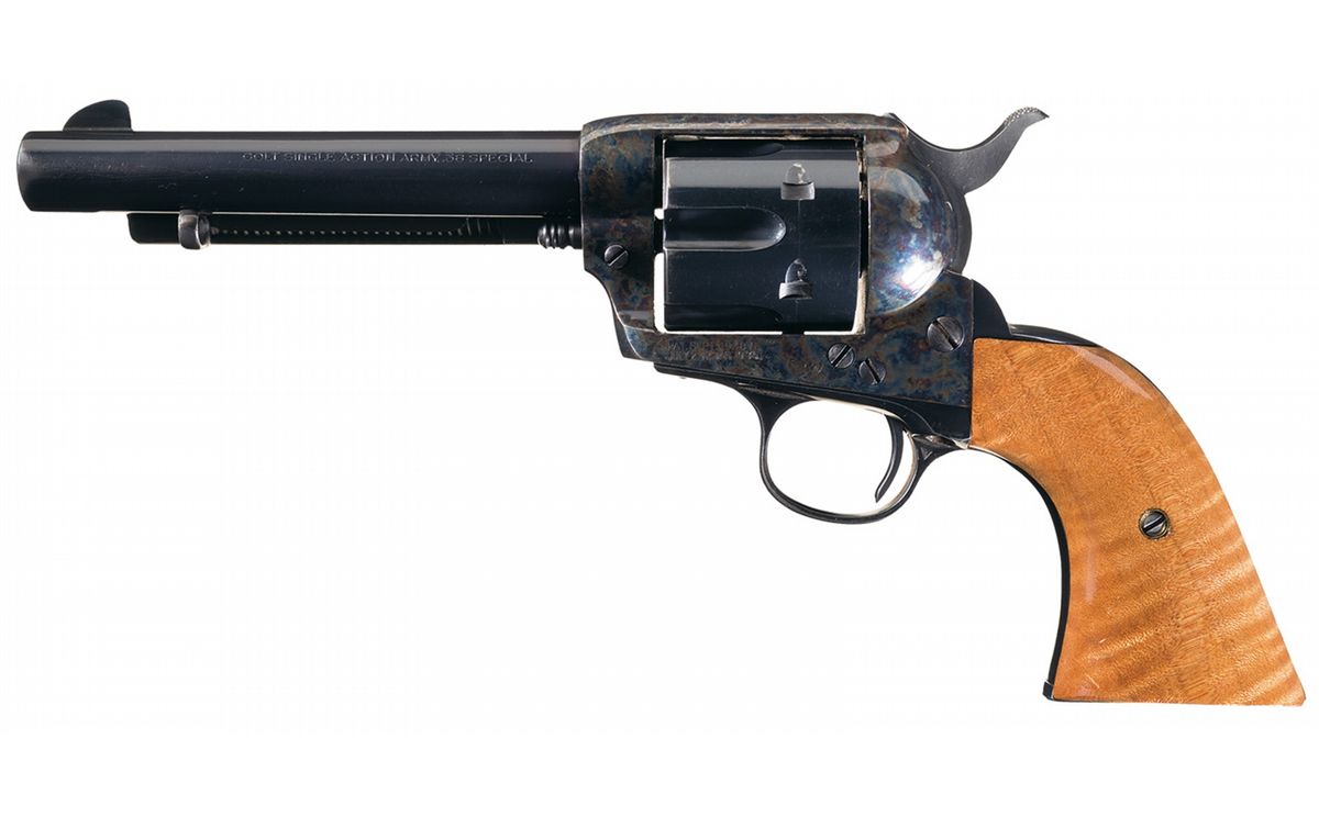 Manufactured in 1901. The one-line address is on the right side of the replacement barrel with "COLT SINGLE ACTION ARMY .38 SPECIAL" on the left side, and the two-line, three-patent dates are on the left side of the frame followed by the circled Rampant Colt. The matching serial number is marked on the bottom of the frame, trigger guard and back strap. The replacement cylinder is numbered, (38 special caliber was introduced in 1930) "207". The loading gate is marked with the assembly number "817". Standard blade front and frame notch rear sights, casehardened frame with blue remaining parts and fitted with replacement smooth hardwood grips.