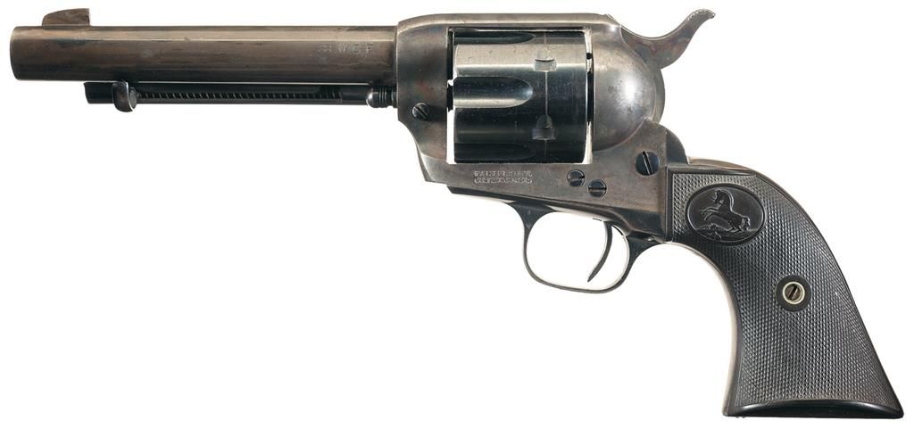 This example was manufactured in 1923. Has the standard blade front and frame notch rear sights. The top of the barrel has the one-line address and the left side is stamped "38 W.C.F.". The left side of the frame has the two-line, three patent date marking with the Rampant Colt to the right. The rear of the cylinder is stamped with the matching number "56". Fitted with a set of checkered hard rubber grips with the Rampant Colt in an oval at the top.
