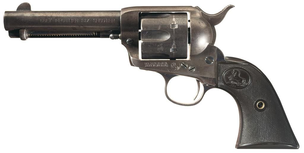 Very good plus. The metal surfaces have traces of blue with the balance a mottled gray patina with traces of original blue finish in protected areas, showing some minor pitting on the cylinder and frame. The grips are fine with the left panel faded to brown and showing some minor wear, a couple dents and crisp checkering. The markings are clear. The action is fine, hand cycles correctly but the timing is slightly off.