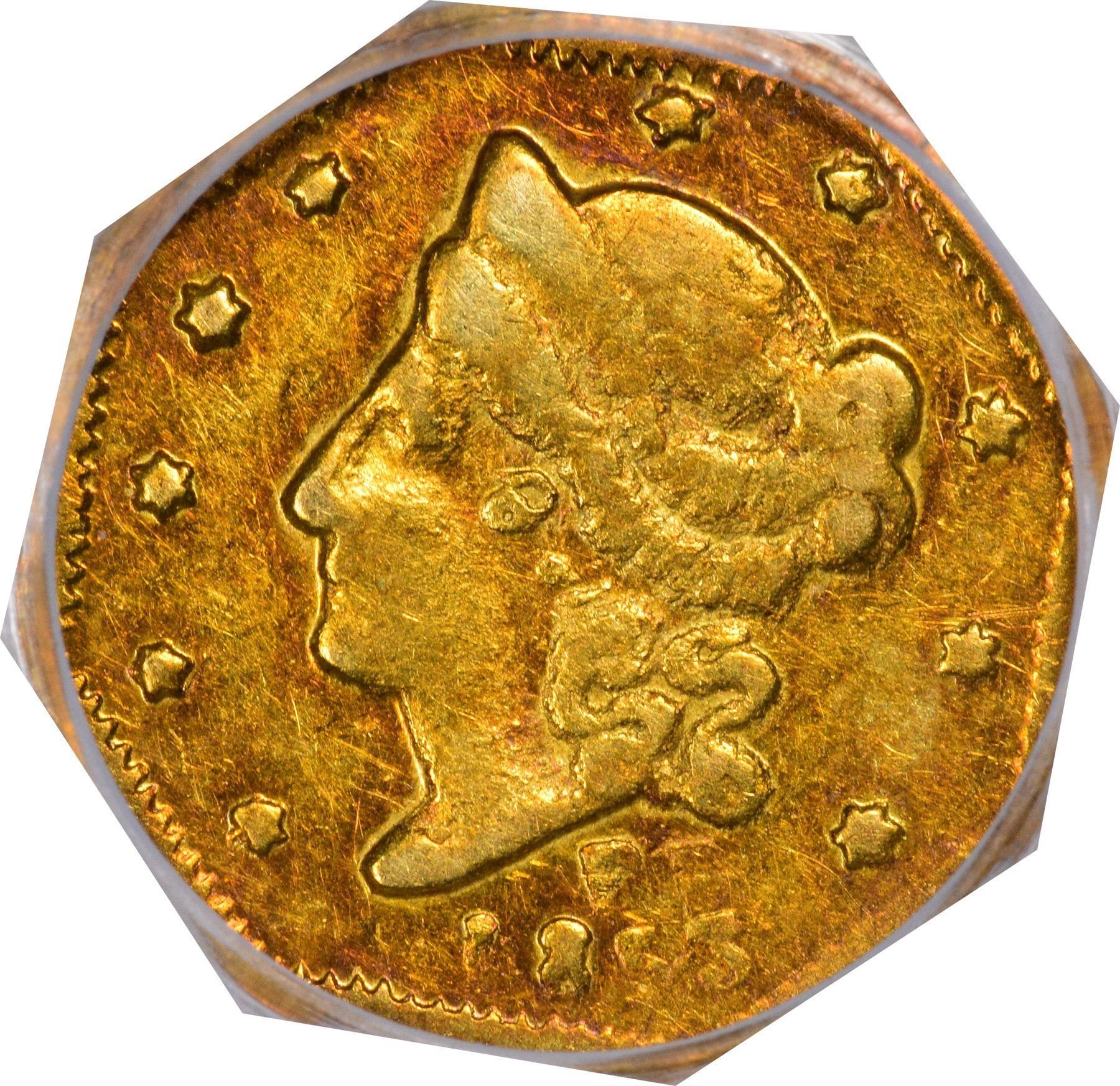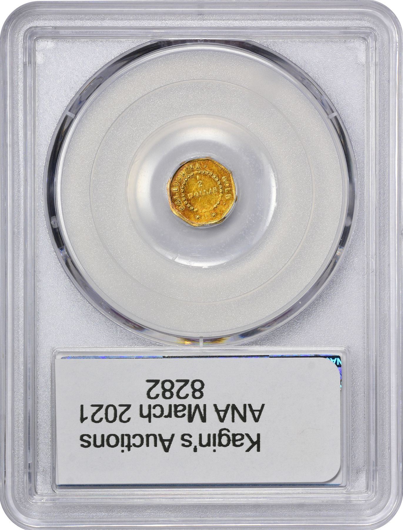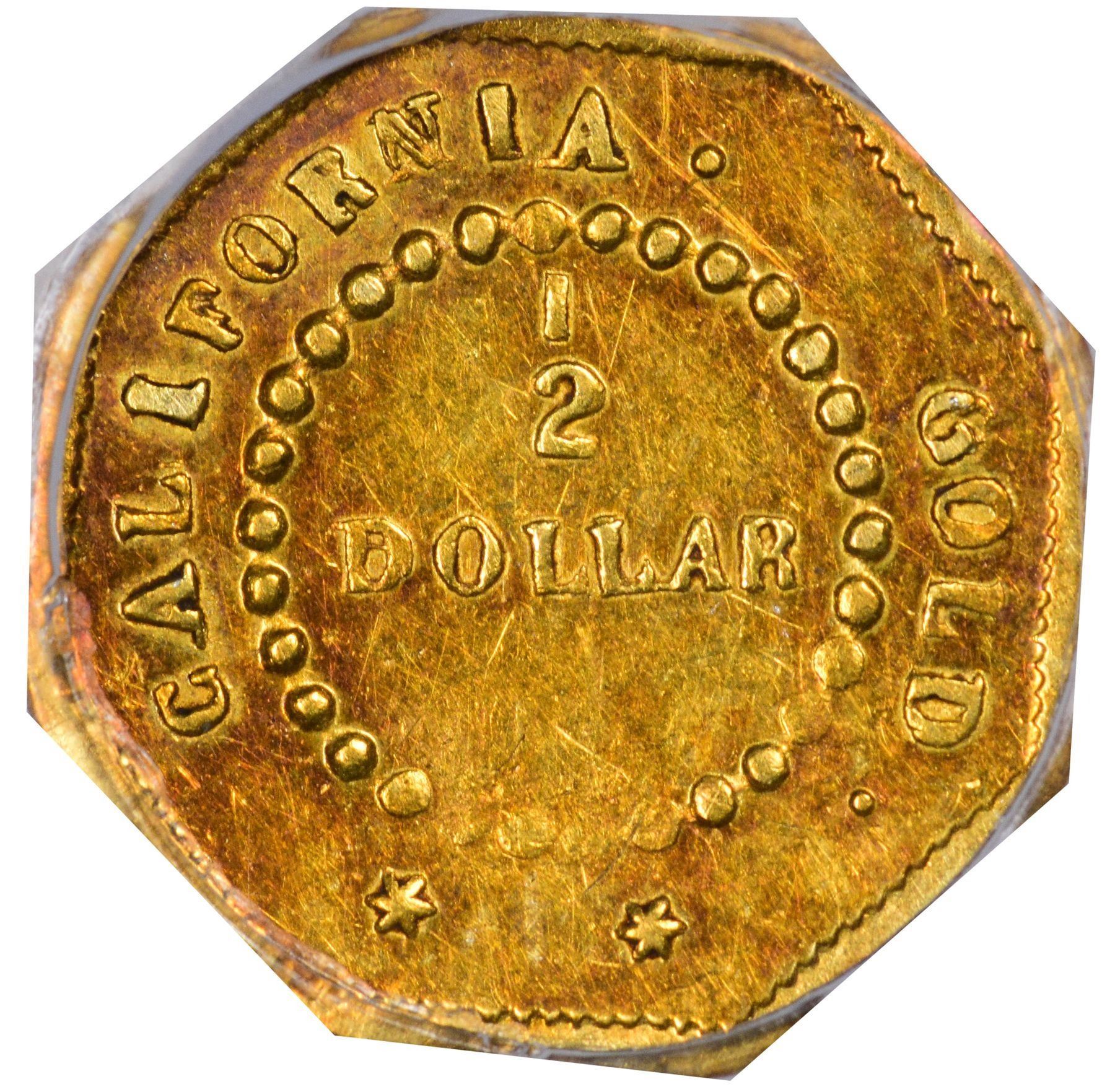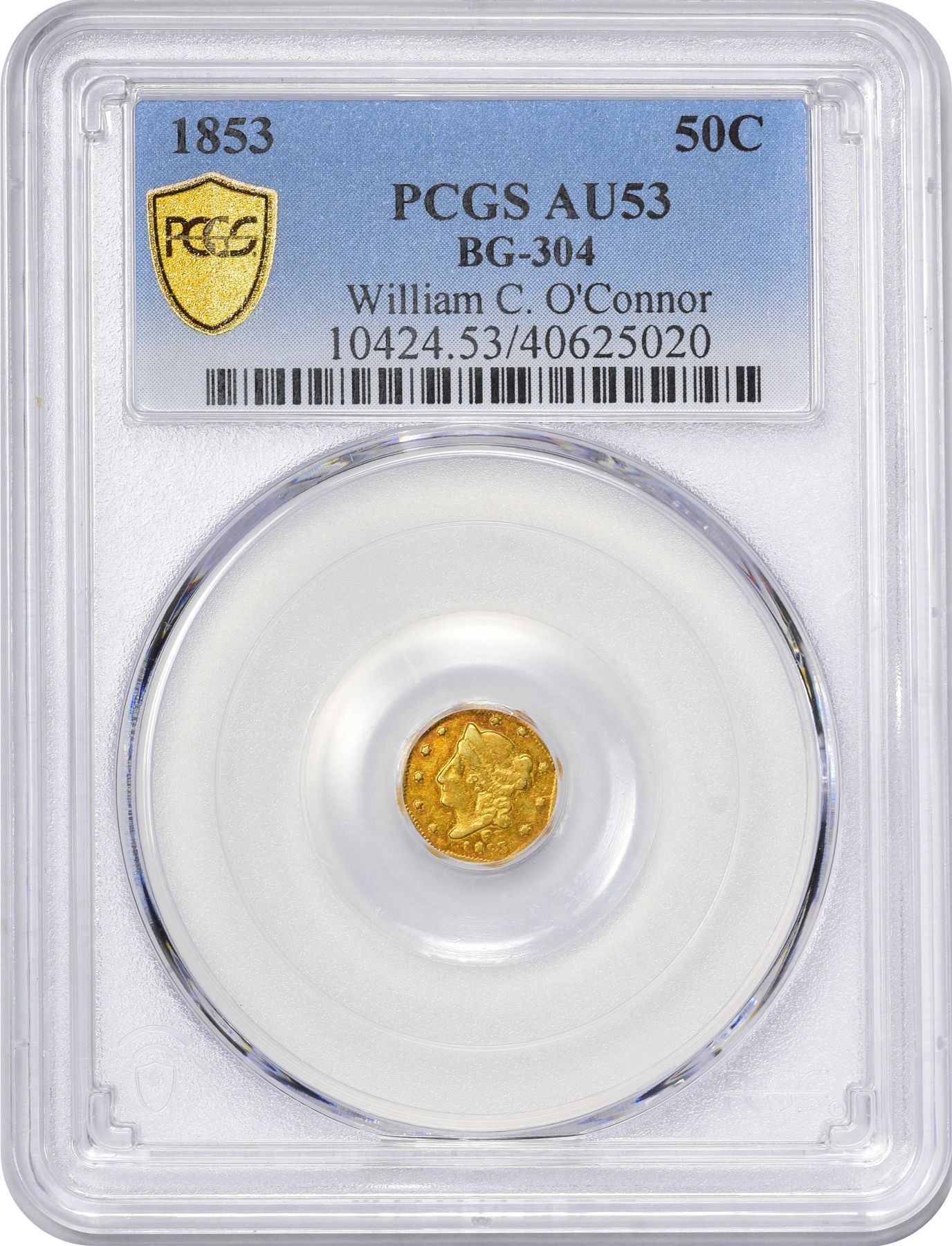 Description: 1853 FD octagonal ½ Dollar, BG-304, Die State II (obverse repolished, but rust marks remaining on head), PCGS AU53. Same obverse die, repolished; reverse CALIFORNIA . GOLD . around 1 (over) 2 (over) DOLLAR in beaded circle, 2 stars below. The eagle has flown away for good on this signed Frontier & Deviercy piece—one wonders why? Rare. Attractive light toning, faintest rub on bust. PCGS AU53 William C. O’Connor (PCGS# 10424).