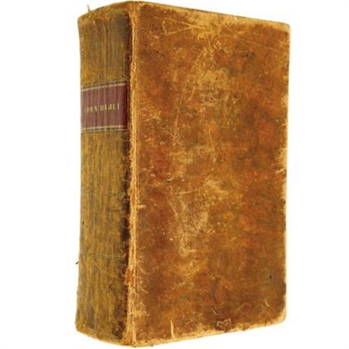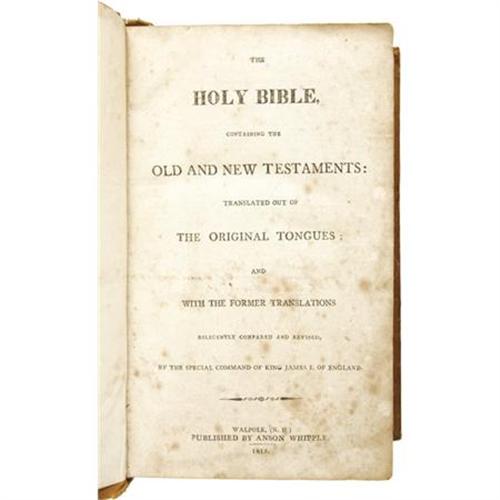 <B>First </B></I><B><I>Holy Bible</B></I></B></I><B> Printed in the State of New Hampshire.</B></I> (Walpole: Anson Whipple, 1815), first edition thus, 959 numbered pages (Apocrypha not paginated), brown calf boards, 8vo (5.5" x 8.75"), previous owner's signature on the verso of the title page "The Property of <I>Charlotte S. Rice of Spencer, presented by her mother 1834</B></I>." Printing in New Hampshire began in 1756 but this was the first complete Bible completed. Anson Whipple was the son-in-law of pioneering American printer Isaiah Thomas and used Thomas's press for this Bible. The typesetting and printing took five years to accomplish and the press run was 8000 copies. This particular copy is in good condition with some expected leather deterioration; the binding is fairly tight with good hinges. A fine addition to any collection of early American Bible printings.<BR><BR><b>Shipping:</b> Books & Catalogs (<a target="_blank" href="http://www.heritageauctions.com/common/shipping.php">view shipping information</a>)