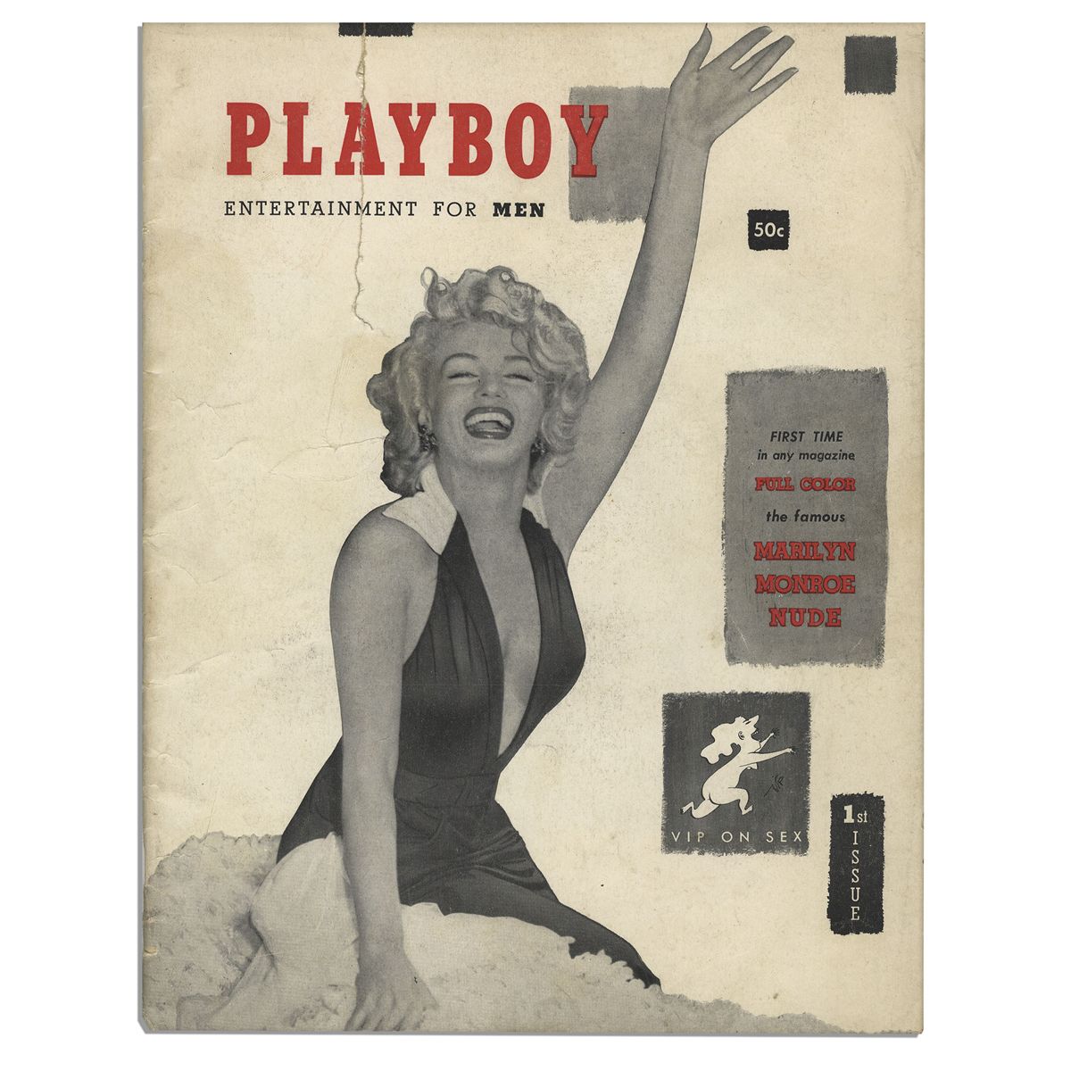 Rare first issue of ''Playboy'' magazine from December 1953, Volume I. Landmark issue of Hefner's controversial men's magazine features the famous color centerfold of Marilyn Monroe. All first issue points are present including the two-staple binding and black square printed to upper right of the front cover. Runs 43pp. and measures 8.5'' x 11''. Closed tear to the front cover measuring 3.5'', minor separation at the base of the spine and toning, else near fine.