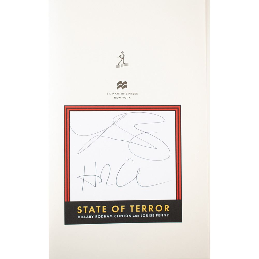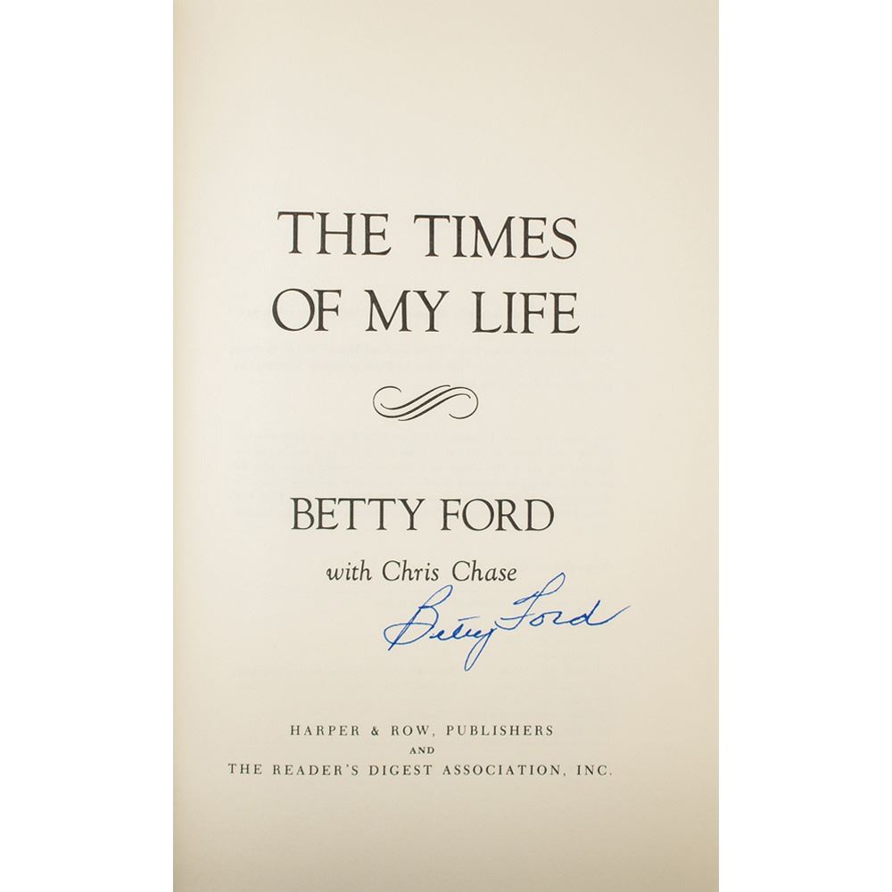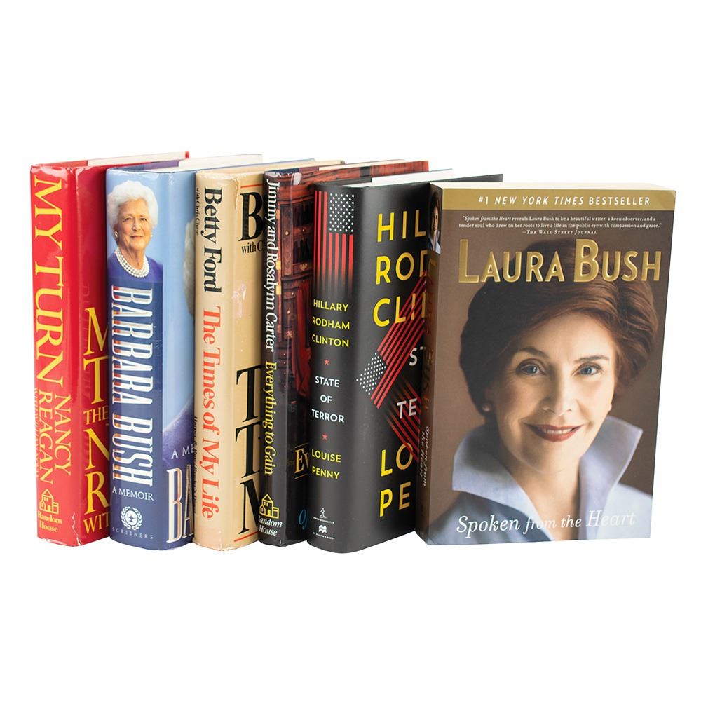Six books signed in ink or felt tip by a former first lady of the United States of America, the majority being hardcover with dust jackets, with signers and titles as follows: Barbara Bush (A Memoir, first edition), Laura Bush (Spoken from the Heart, first edition softcover), Rosalynn Carter (Everything to Gain, first edition, also signed by Jimmy Carter), Hillary Clinton (State of Terror, first edition, also signed by co-author Louise Penny), Betty Ford (The Time of My Life, later printing), and Nancy Reagan (My Turn, later printing). In overall fine condition, with a tear to Reagan dust jacket.
