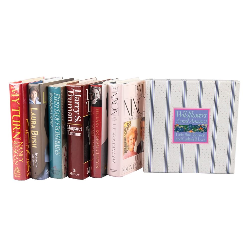 Seven books, each hardcover with dust jackets or slipcases, individually signed on an affixed bookplate or an opening page in ink or felt tip by a former first lady, including: Laura Bush (first Scribner hardcover edition of Spoken from the Heart), Rosalynn Carter (First Lady from Plains), Hillary Clinton (first edition of Living History), Lady Bird Johnson (Wildflowers Across America, special edition fabric-bound with slipcase, also signed by co-author Carlton B. Lees), Pat Nixon (Pat Nixon: The Untold Story), Nancy Reagan (first edition of My Turn: The Memoirs of Nancy Reagan), and Bess Truman (Harry S. Truman). In overall fine condition.