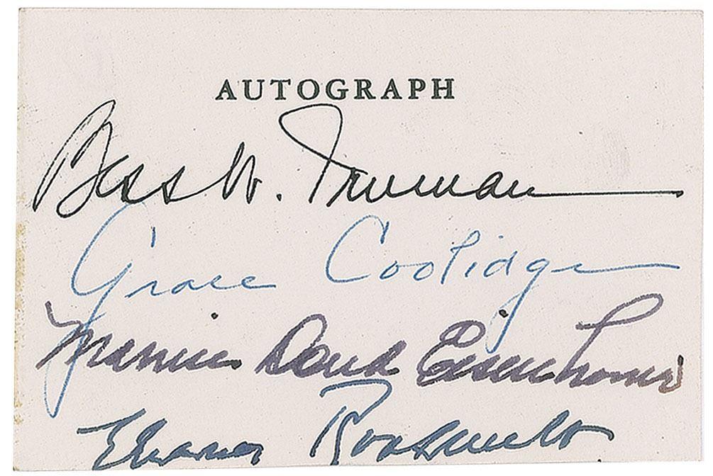 Ink signatures of Bess Truman, Grace Coolidge, Mamie Doud Eisenhower, and Eleanor Roosevelt on an off-white 3.75 x 2.5 slip. In fine condition, with trimmed edges.